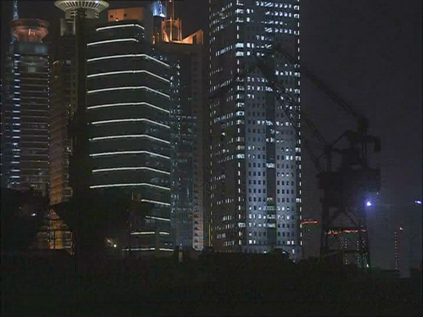> Night view of city beach, industrial cranes and concert lights