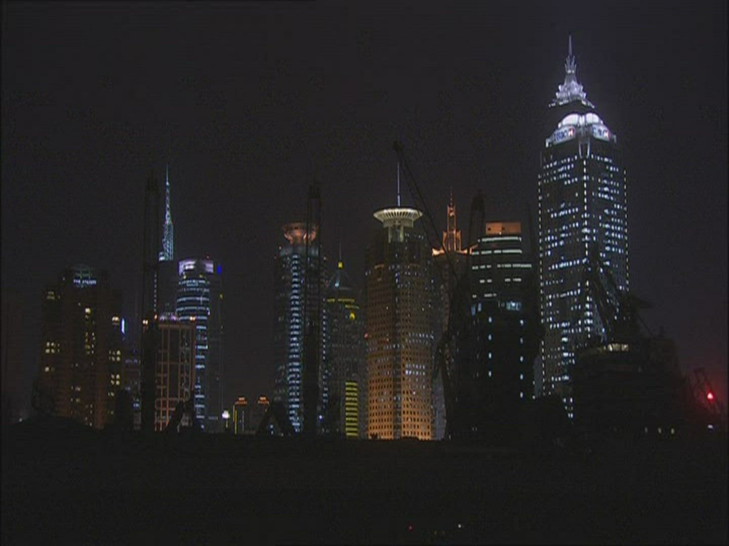 Night beach with many garbage containers and people walking in the distance. View with industrial cranes and stage lights in background