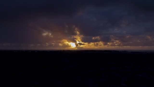 Speed-up shot of the big sun moving up in the orange sky, clouds sailing beneath. Hot sunrise