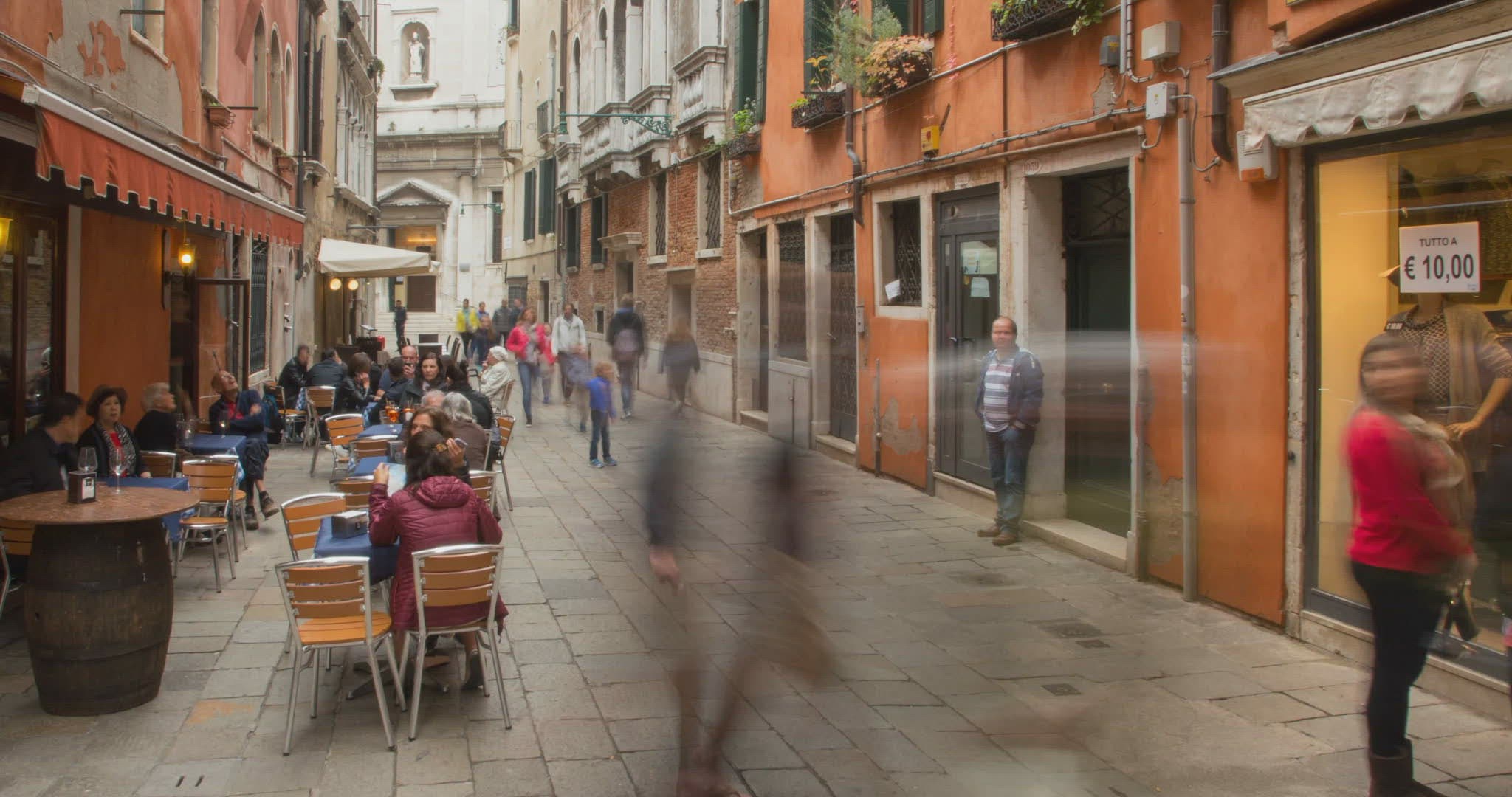 A gray rainy day in the city, rain drops fall on the black table and chairs of a street cafe, a menu is hanging on the wall of the house, written with white chalk on a black board