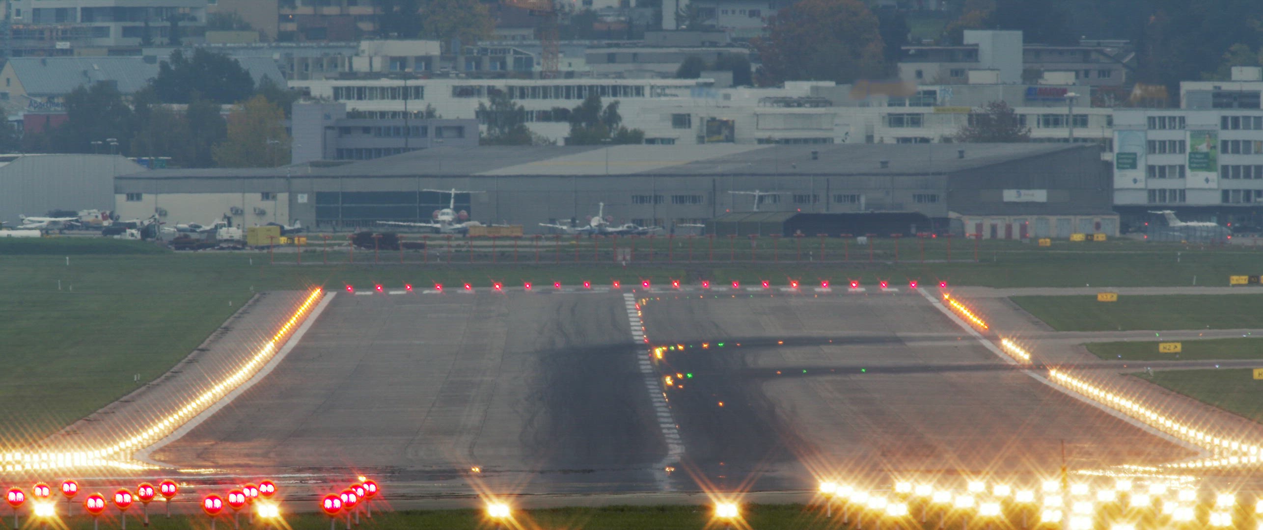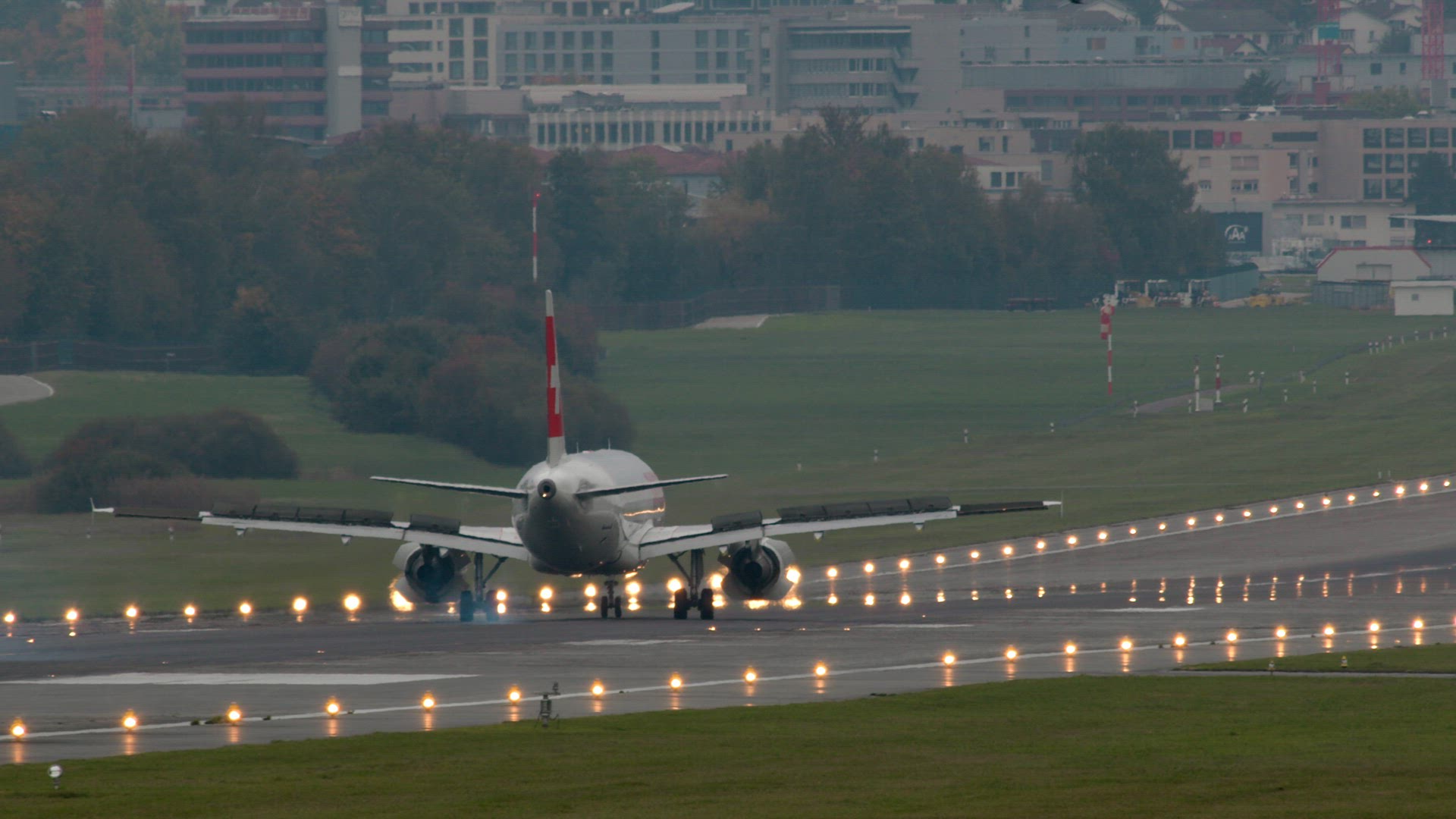Wide shot - passenger airplane, with the side lights on, is landing, flies over an autumn field covered with grass, against the background of the gray foggy evening sky. Switzerland, Zurich
