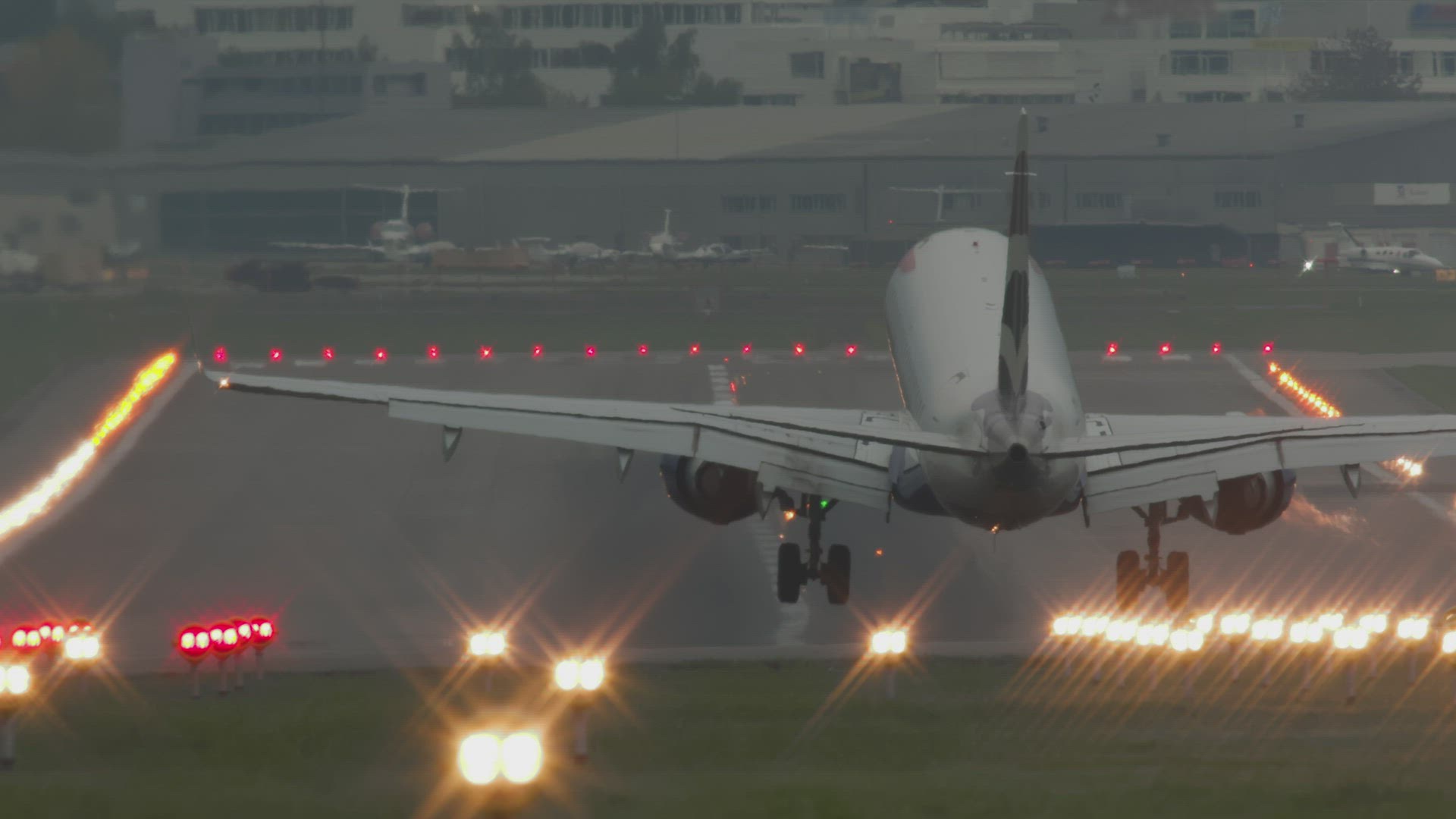 > Passenger plane landing at the airport - slow motion