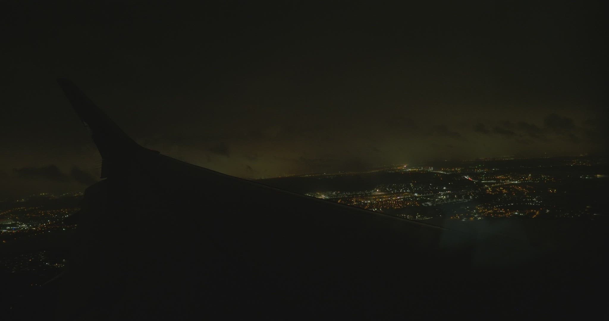 A passenger plane with side lights on, lands at night against the backdrop of a black sky passing the frame