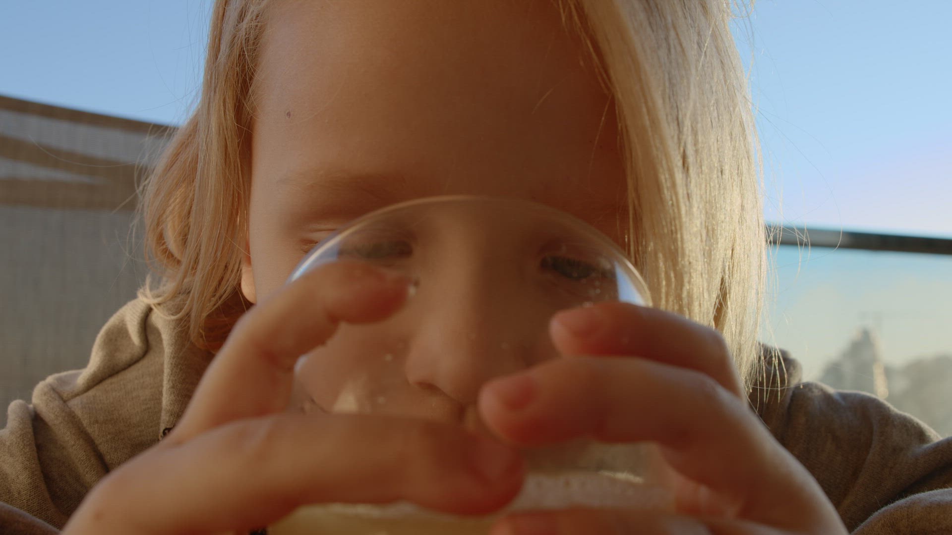 Close-up shot of a little girl drinking lemonade of juice and looking into the glass. Thirsty funny kid on the balcony