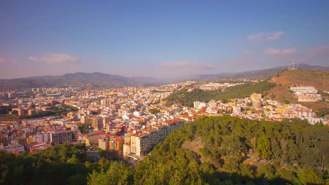 Urban scenery in the dawn. Morning sun with rays shining from behind the city buildings. Benidorm, Spain