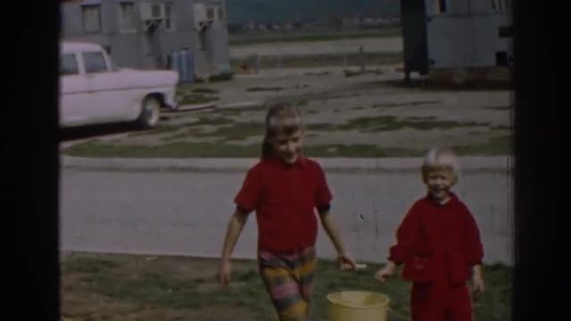 > Big brother and little sister walking across the road holding hands