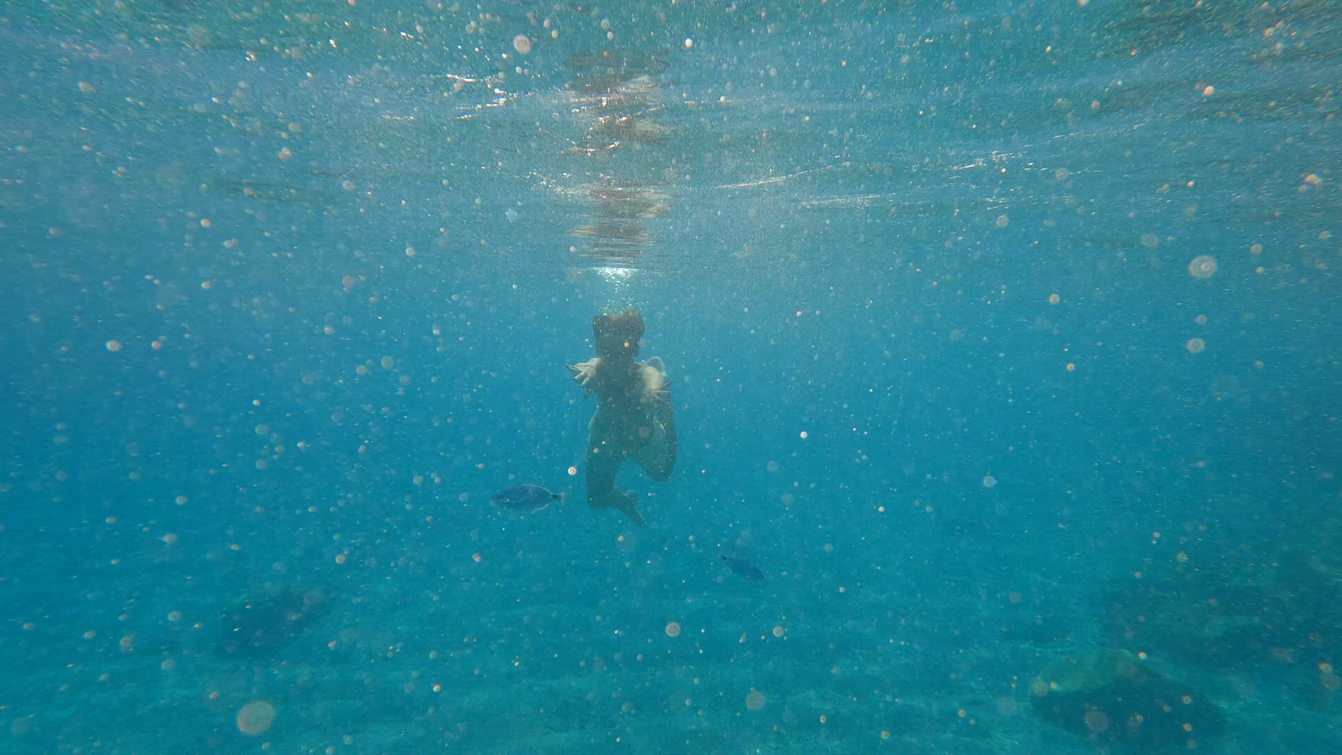 Slow motion - a teenager swims underwater, in blue transparent sea water, among fish and air bubbles