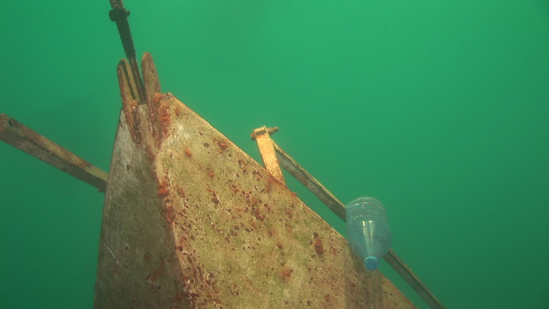 Underwater - a plastic bottle thrown away by people floats, surrounded by fish in the rays of sun, harming the environment