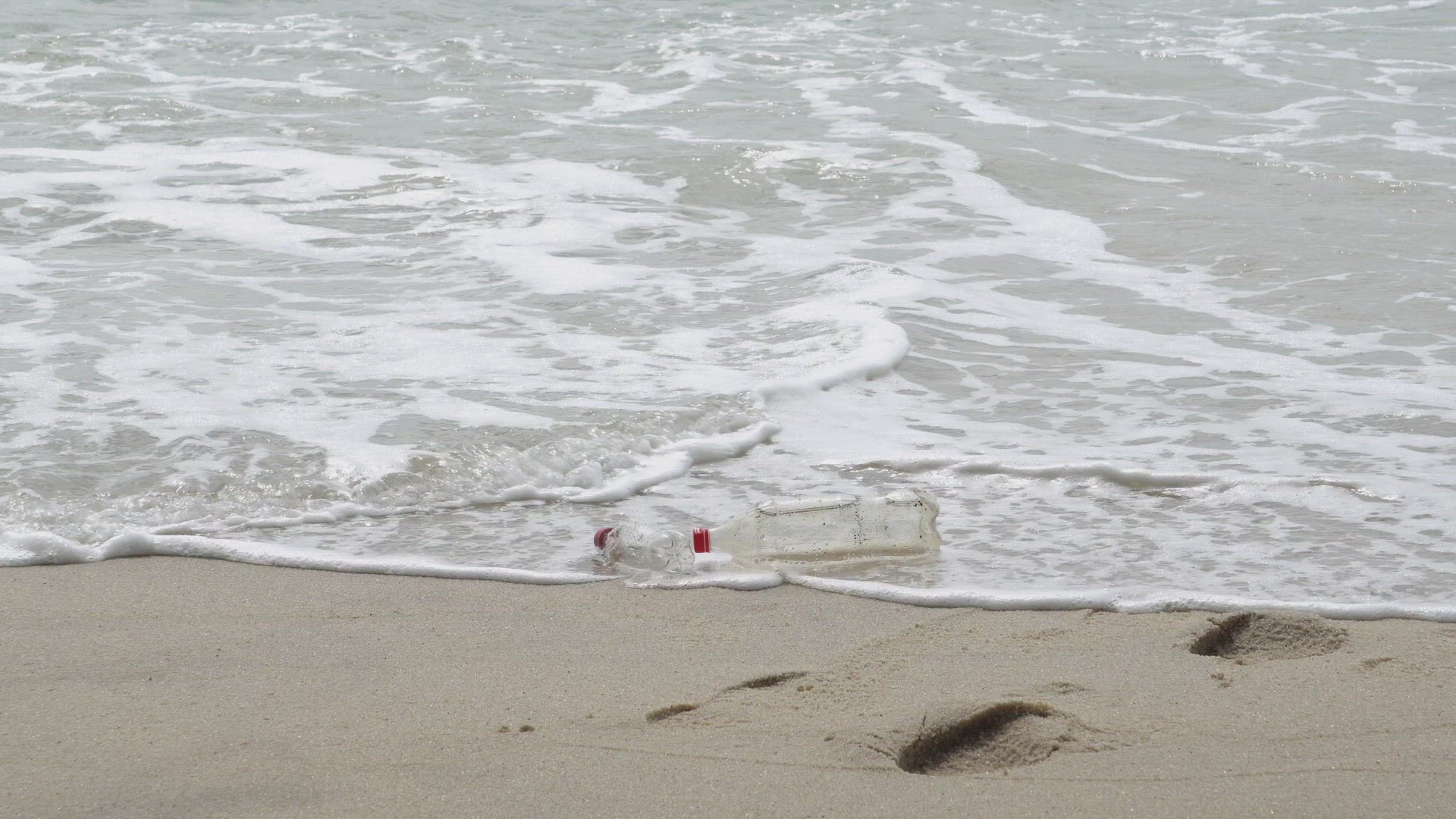 Plastic bottle thrown away by people floats harming the environment underwater in the rays of the sun