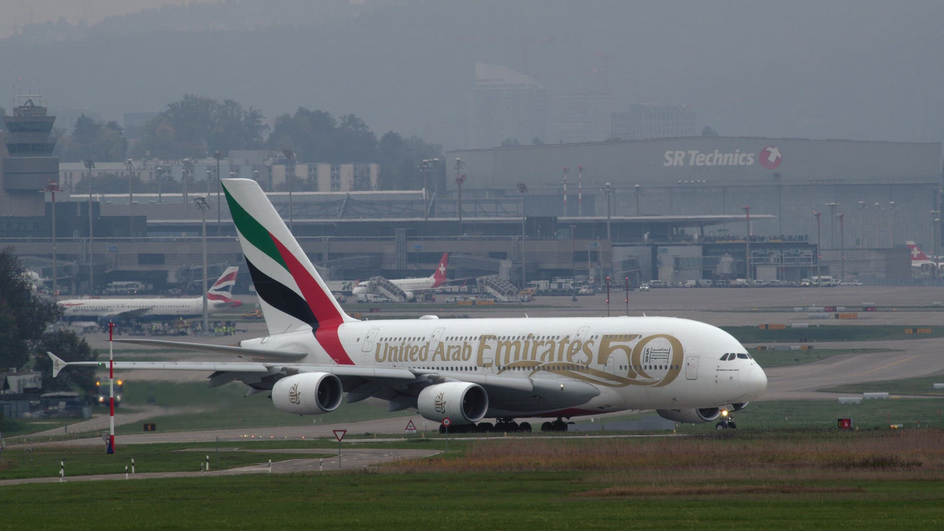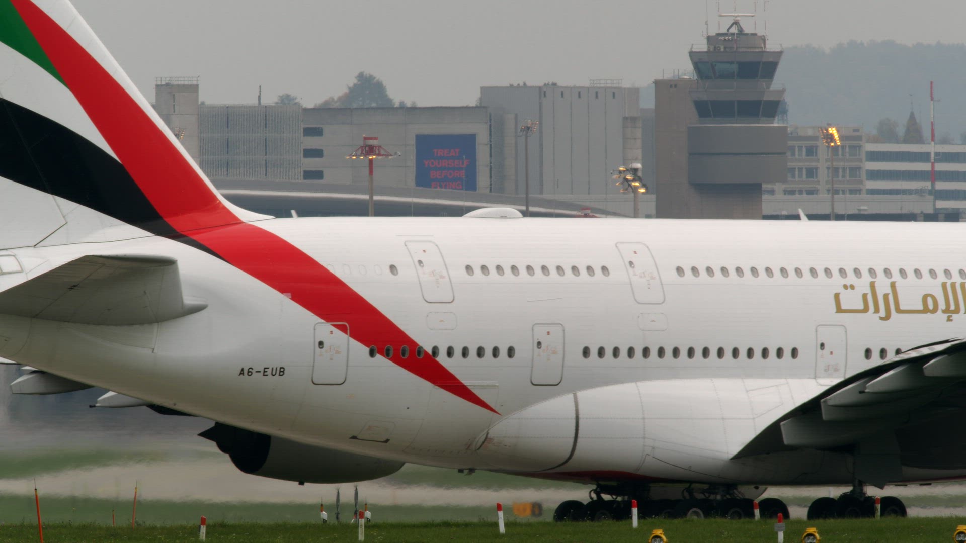 > Emirates Airbus A380-800 taxiing taxiing down the runway