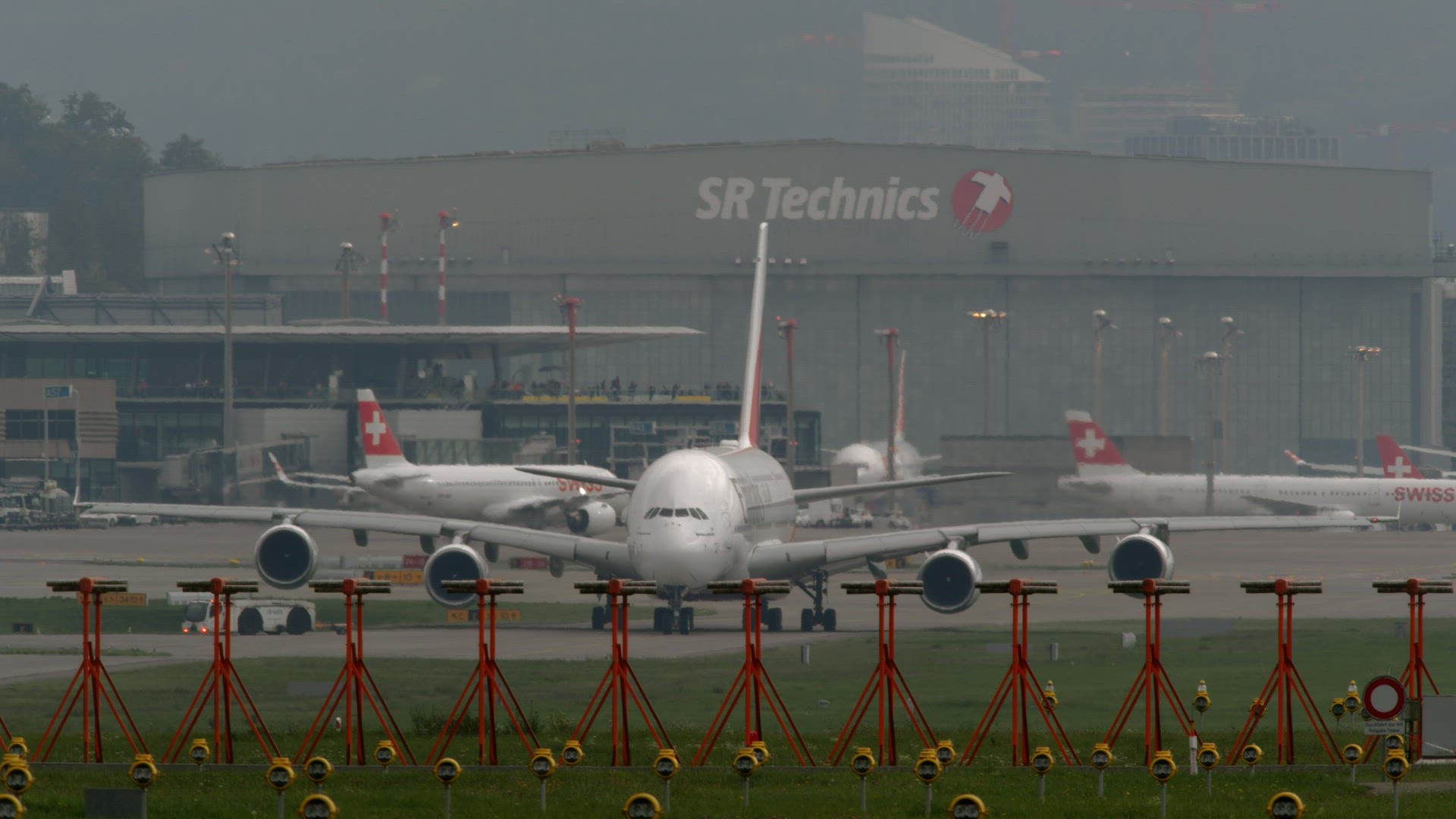 ZURICH, SWITZERLAND - OCTOBER 13, 2022: Emirates Airbus A380-800 Superjumbo Jet taxiing with an airfield tractor
