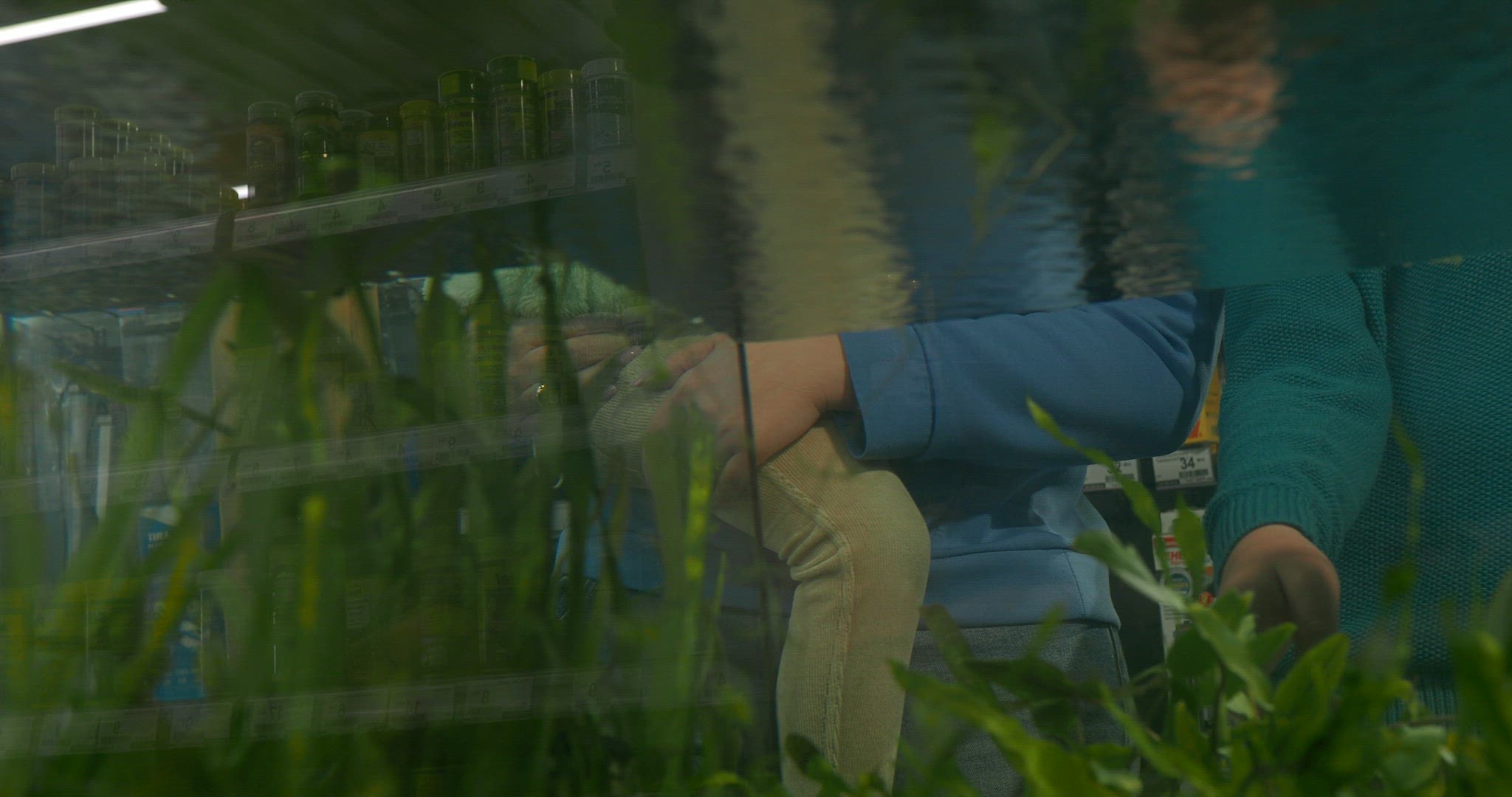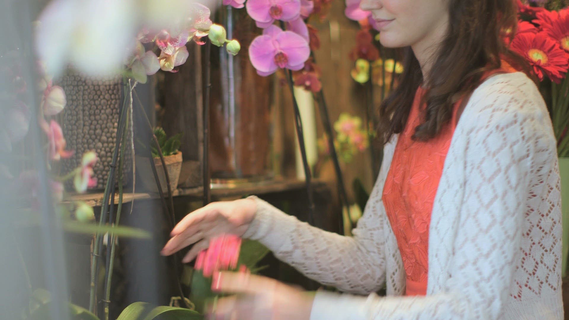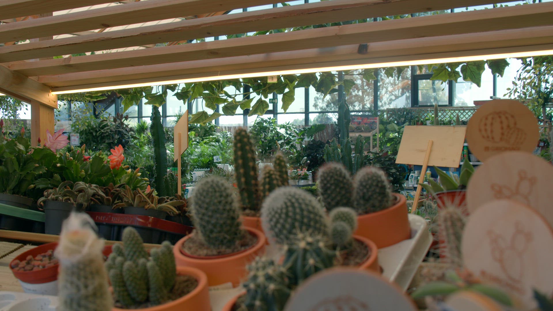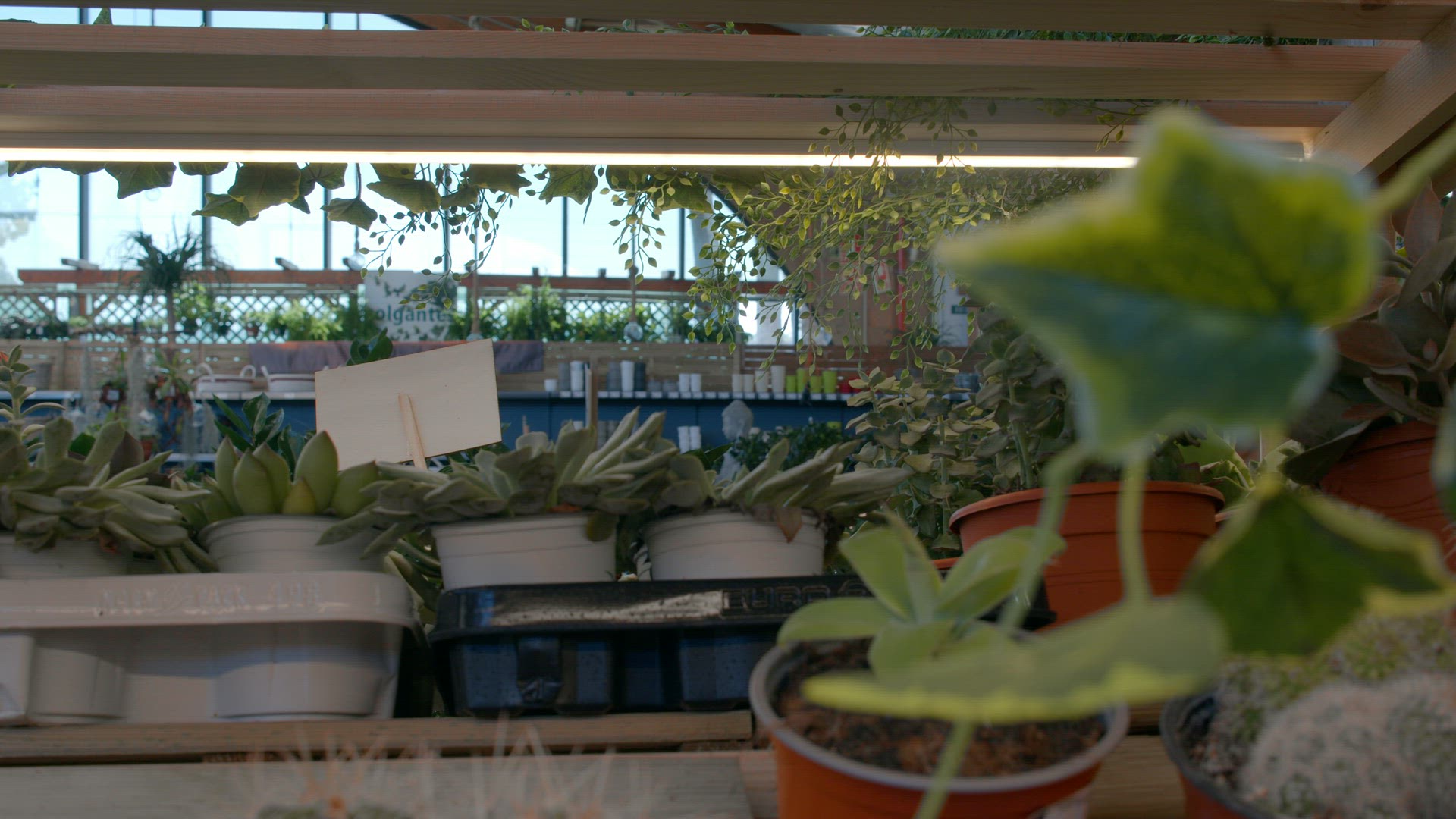 A young woman in a green dress chooses houseplants in a greenhouse or garden center