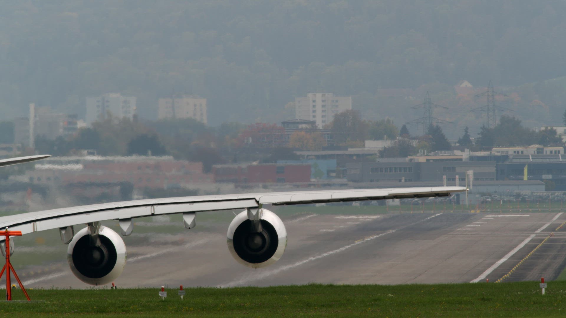 A passenger airplane is landing on a runway illuminated by lights, A380-800 is taxiing in the background
