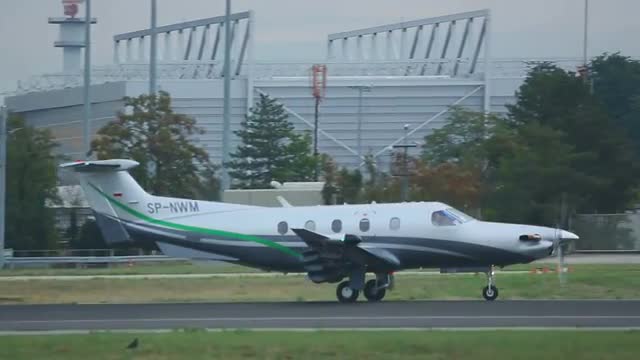 Wide low angle shot of airplane flying overhead - small airplane arrives to the airport against the background of a gray evening sky
