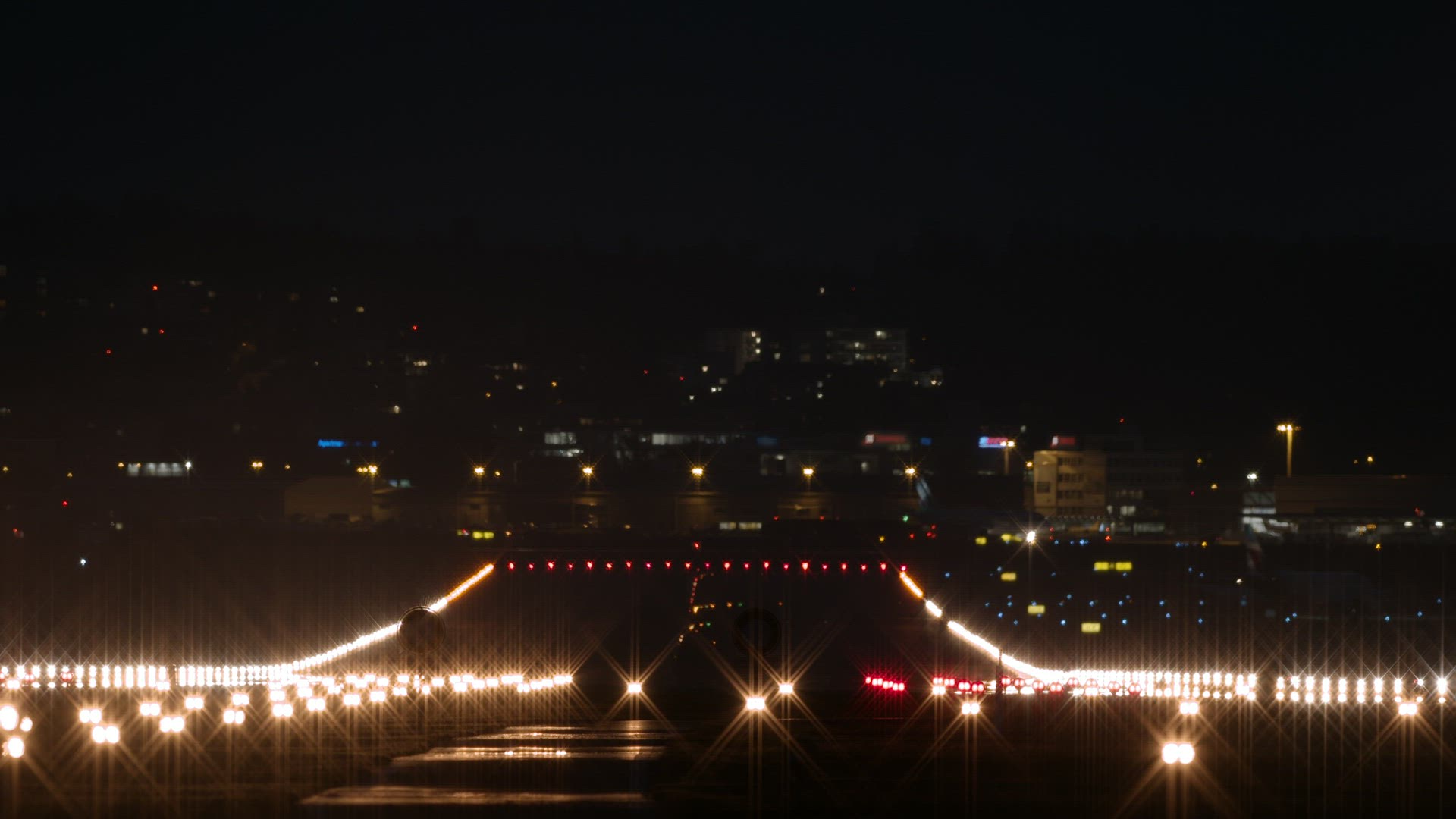A commercial airplane descends and lands on a runway at an airport at night, as its dark silhouette contrasts against the glowing city lights in the background