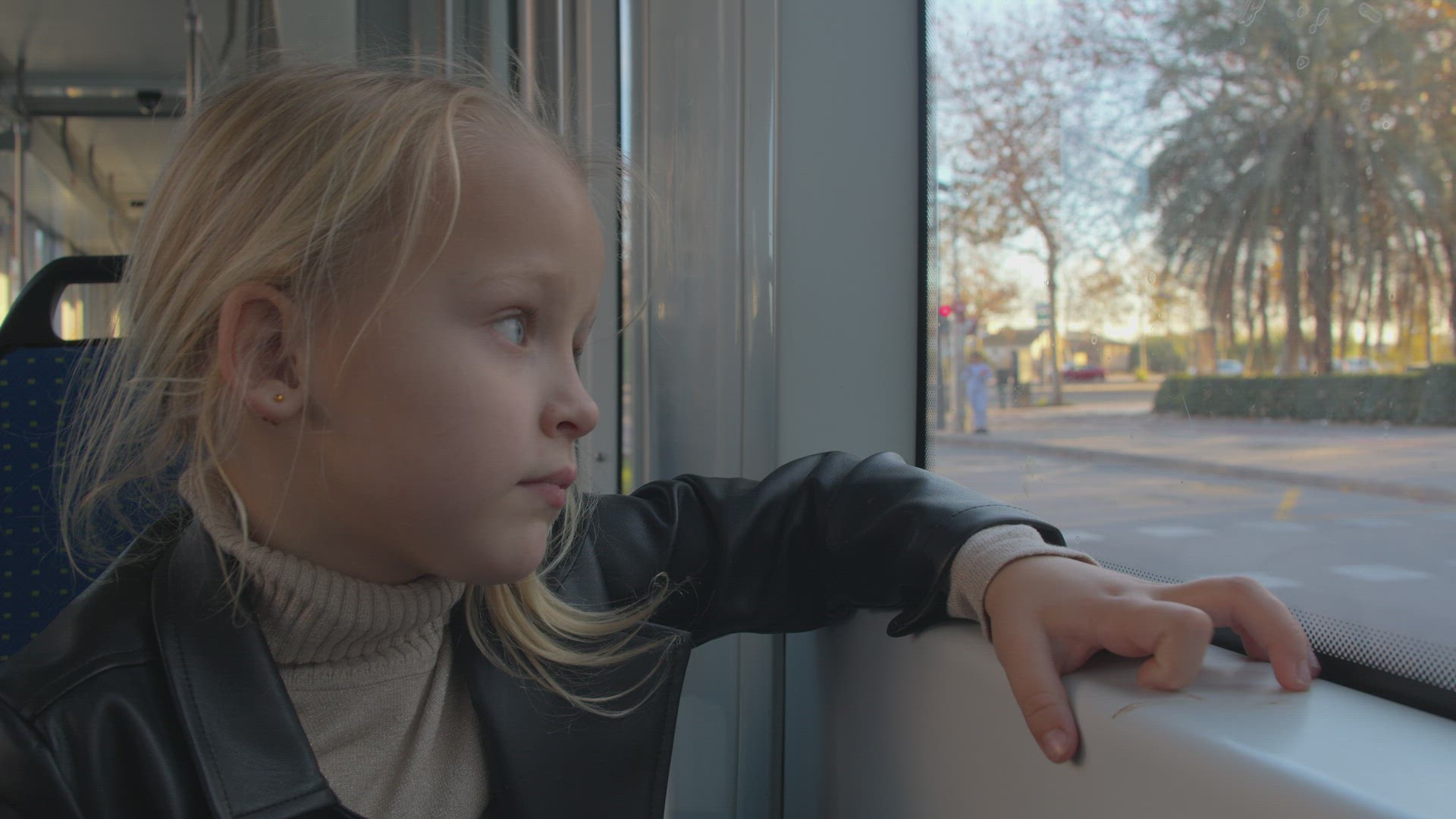 Close up shot of a 5-year-old girl is riding a subway train as it passes through a street. Sitting by the window, she looks out and basks in the sunlight