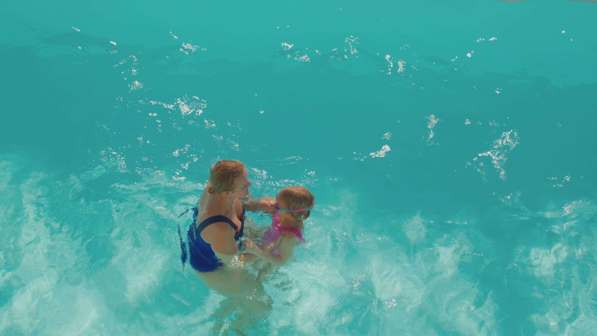 From a high angle, slow motion capture, a mother playfully tosses her young daughter up in the air while in the swimming pool, then lets her swim independently