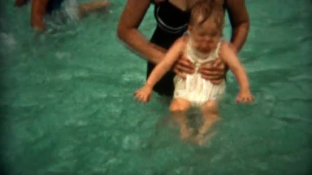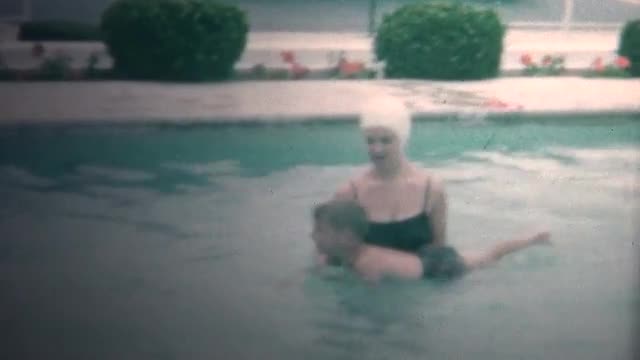 Wide shot from above - mom supporting and teaching daughter to swim in pool on sunny summer day