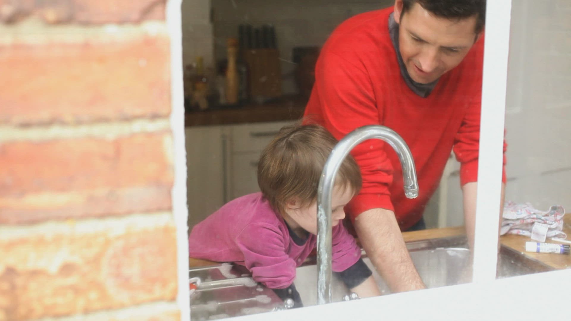 Five-year-old blonde caucasian girl in a blue shirt opens the faucet in a sink, washes her face while looking in the mirror, and smiles at her reflection