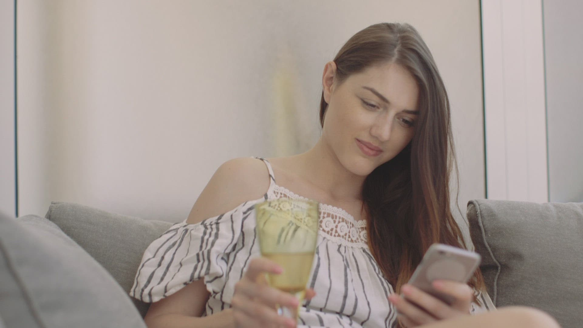 Wide shot - a 40-year-old Caucasian blonde woman sits on a hanging chair on her balcony in the evening, holding a glass of wine and reading something on her smartphone