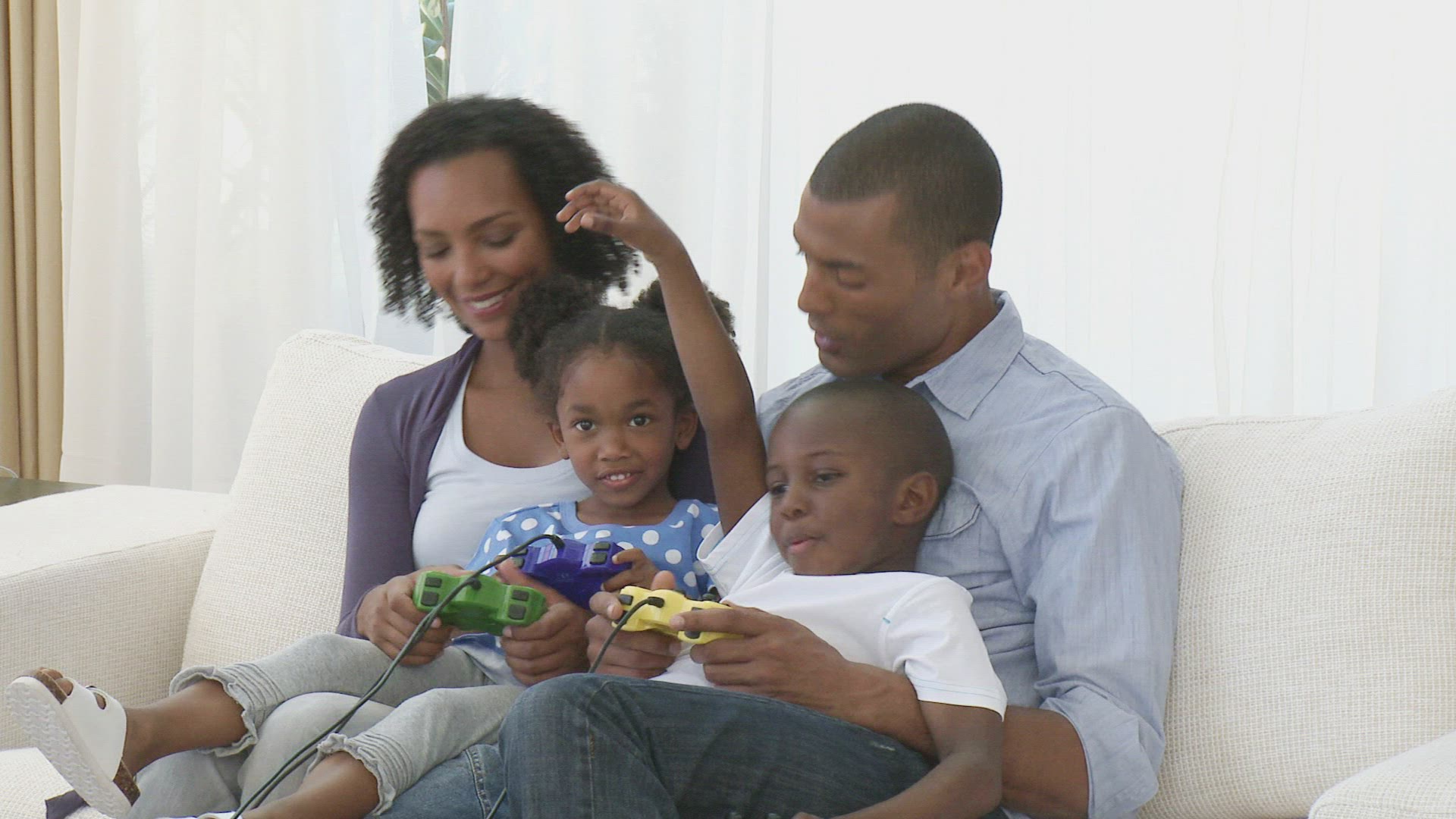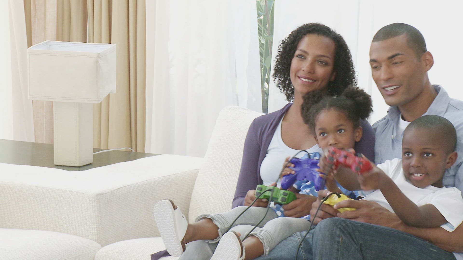 Brother and sister enjoy playing video games on a console while sitting on a balcony swing chair