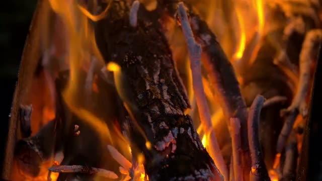 Close-up view of glowing embers, burning coals, which emit a bright, warm glow