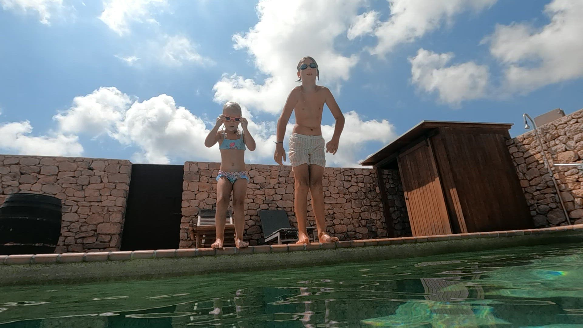 A 12-year-old boy dressed in a striped t-shirt and his 5-year-old sister wearing a blue t-shirt stand in front of a mirror washing their faces with water. They exchange glances and smiles as they enjoy this morning ritual together