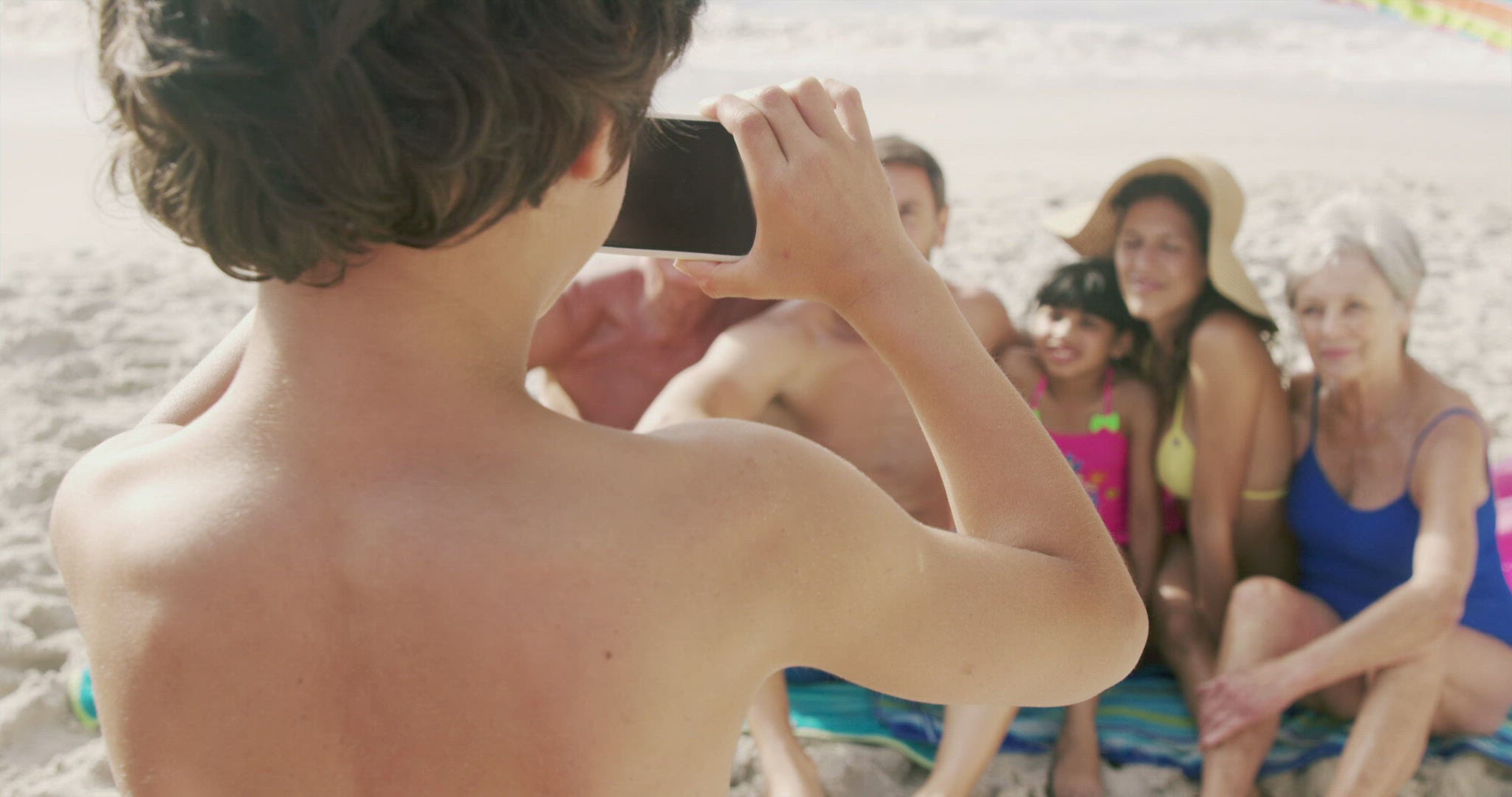 > Mother and daughter watching something on smartphone at ocean beach