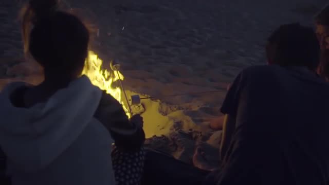 A family of four, consisting of a 40-year-old father, 40-year-old mother, 12-year-old son, and 5-year-old daughter, are sitting on an ocean beach in the late evening, huddled together and engrossed in whatever is playing on their phone screen