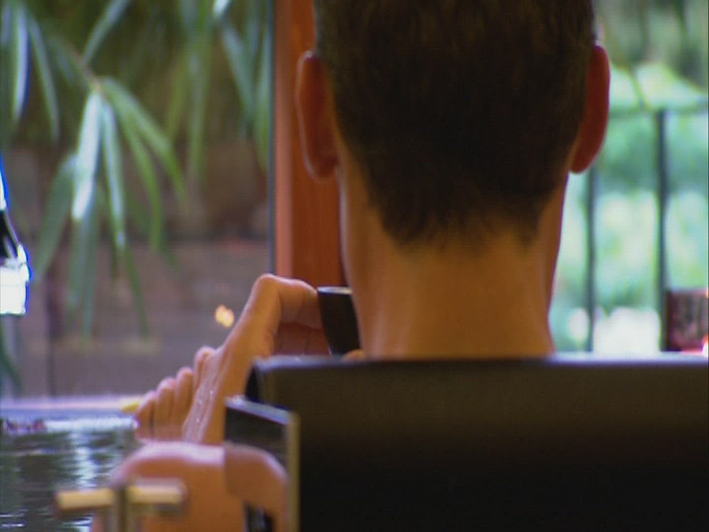 Close-up of a 12-year-old Caucasian boy's head, with only his mouth and a small part of his face visible above the water, as he lies face-up in a warm outdoor hot tub, with palm trees reflecting in the water and a palm tree in the background, enjoying a relaxing vacation