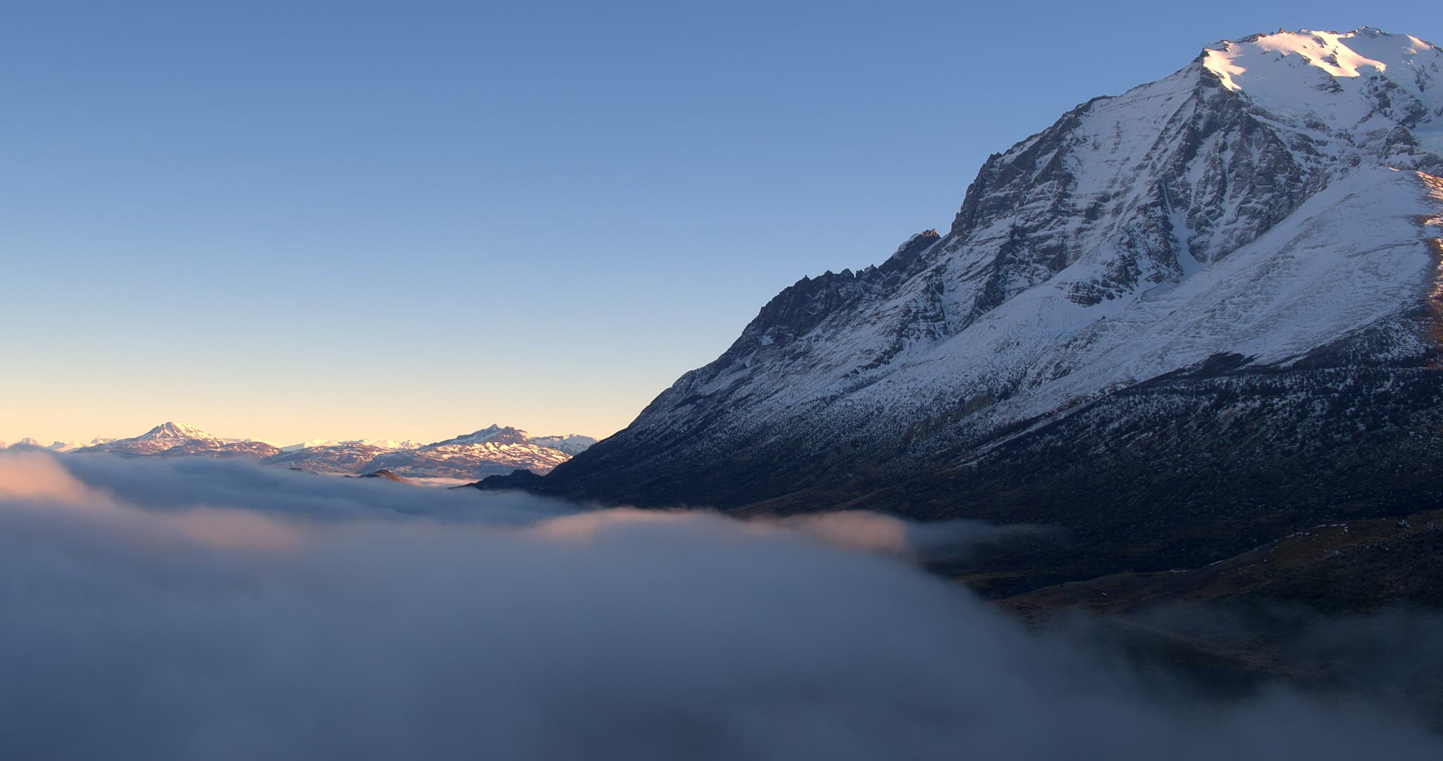 Aerial Pan Up Above Clouds Beside Magallanes Region Mountains During Golden Hour. Establishing Shot