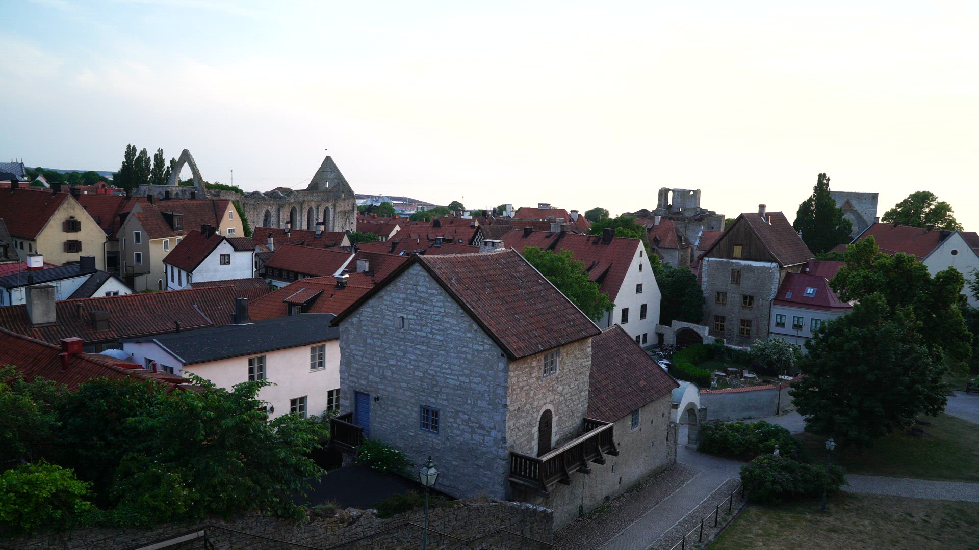 view over central Visby at dusk - evening shot - people walking in street - gotland