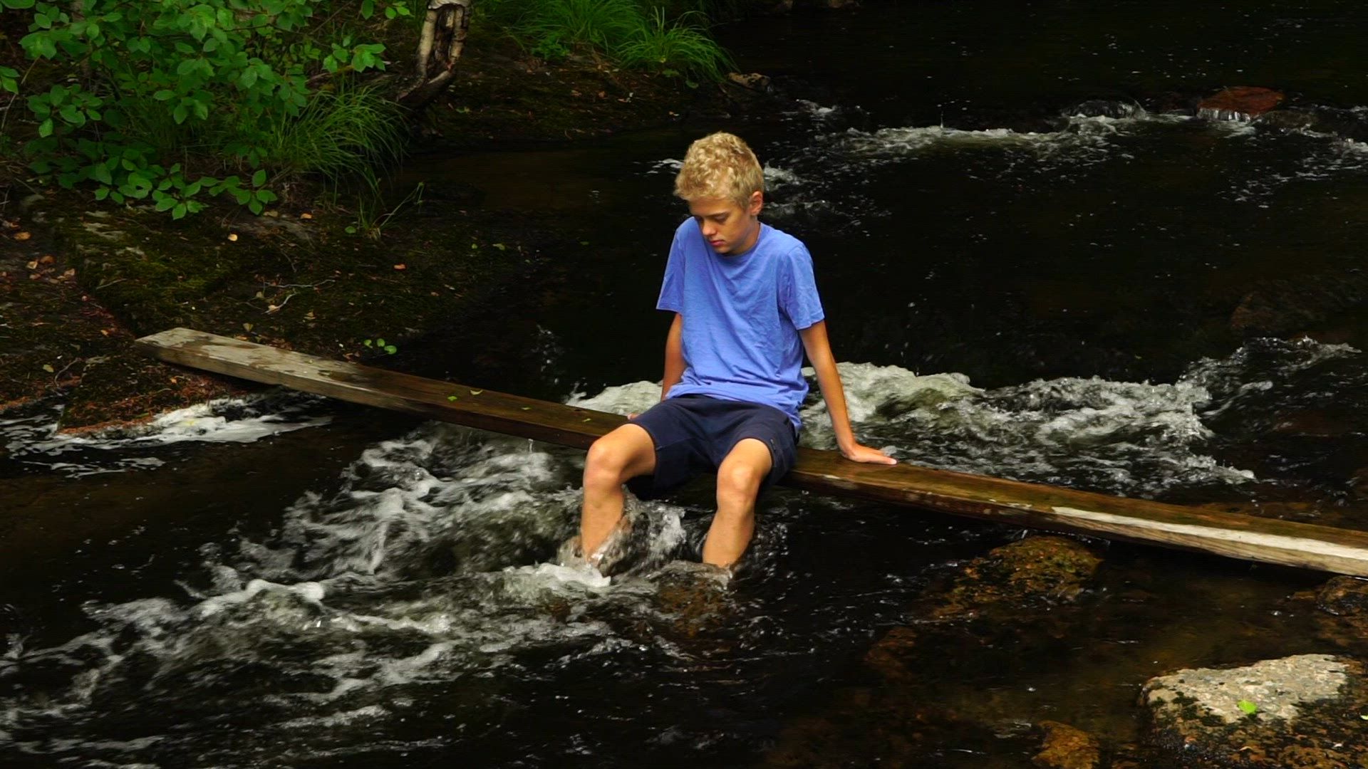 > young boy sitting on plank over river - feets and legs in streaming water - slow motion shot