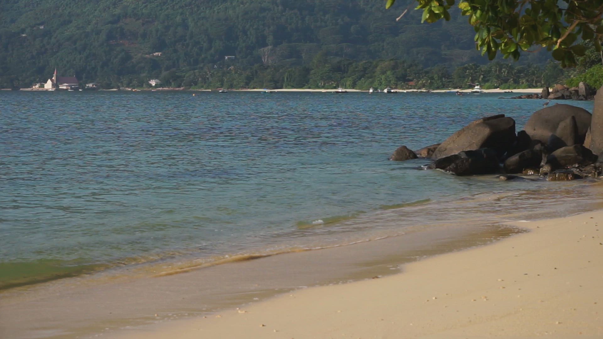 Locked off shot of the sea lapping a calm beach