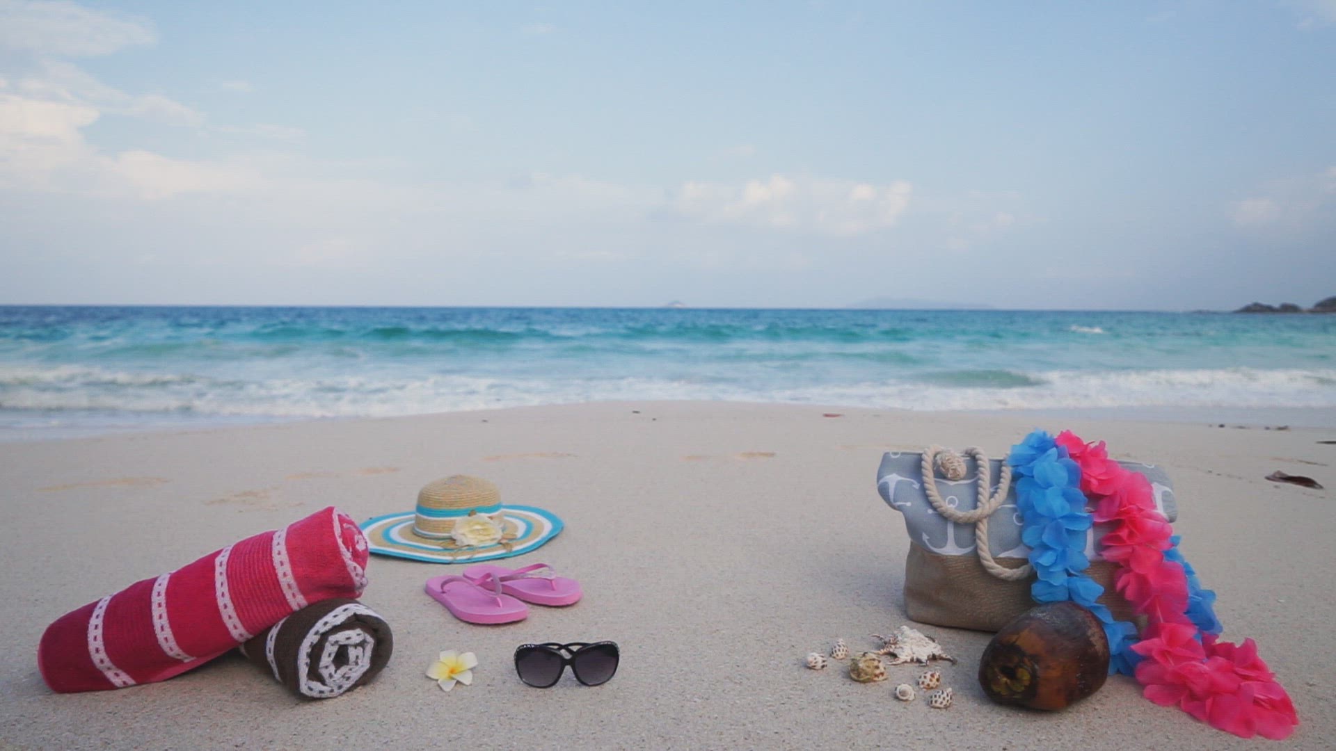 Locked off shot of beach clothes on the sand in front of the sea