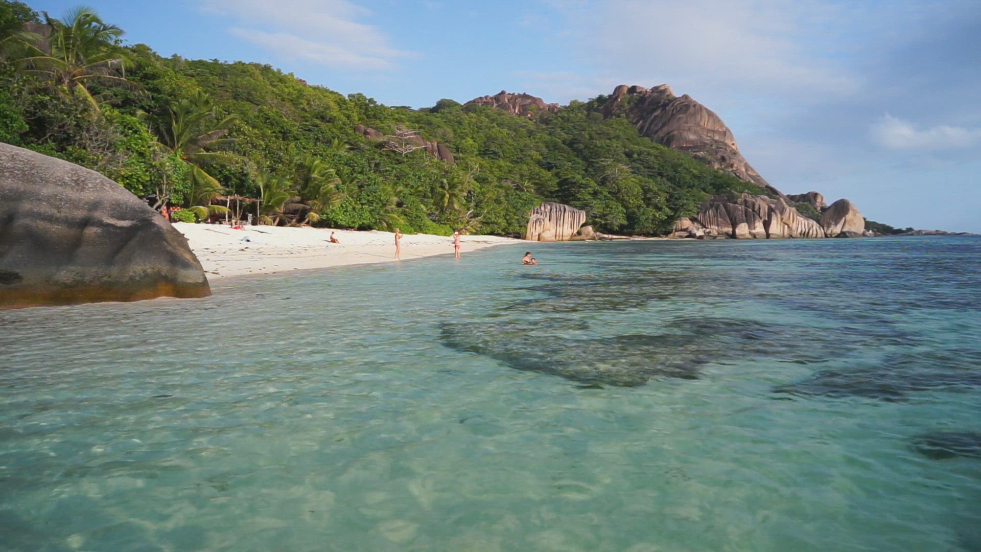 > Long shot of people standing on a tropical beach