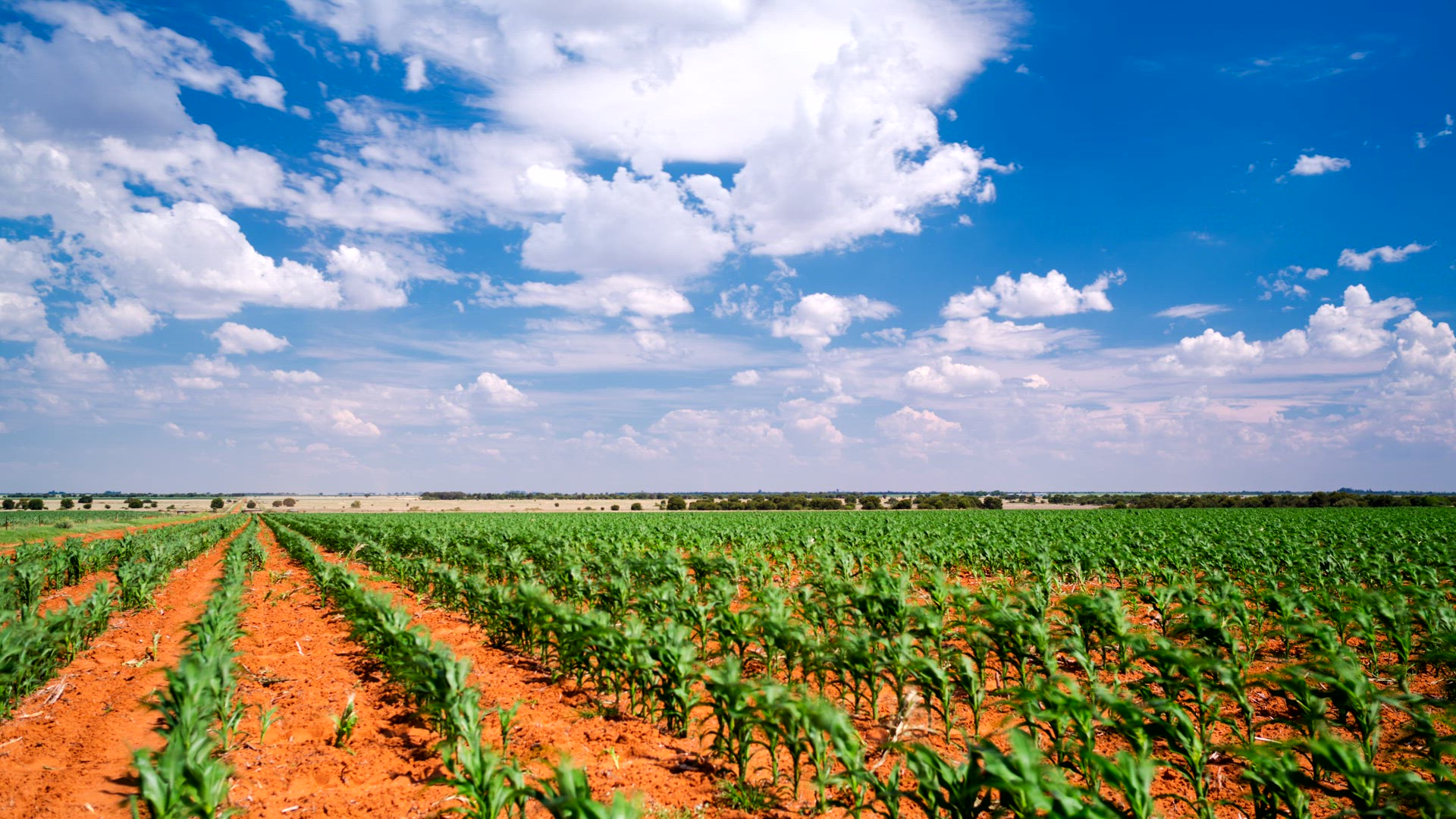 > Wide angle static timelapse of young corn field, showing view of farm land and tractor in distance on bright sunny day, cumulous clouds building up for rain, blue sky, South Africa.