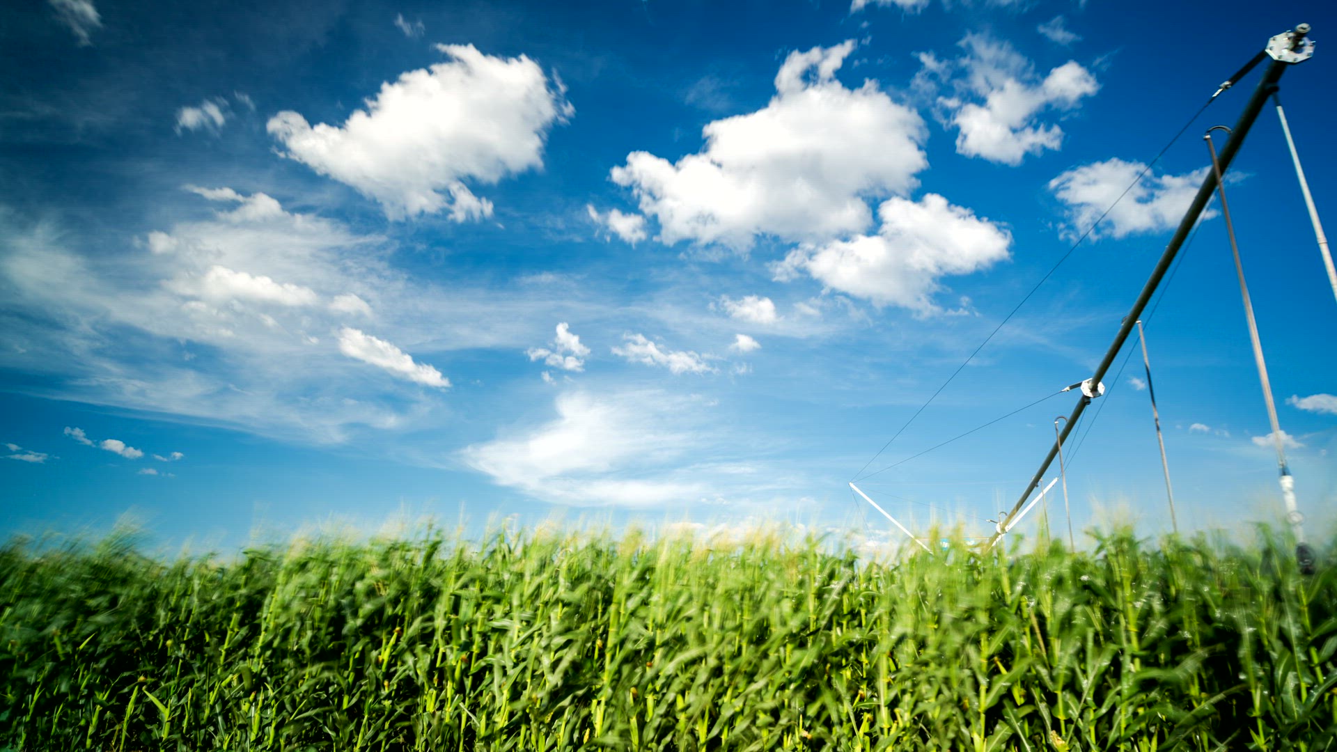 > A static daytime timelapse of green corn fields (maize) while centre pivot irrigation system waters the field with cumulous clouds against blue sky.