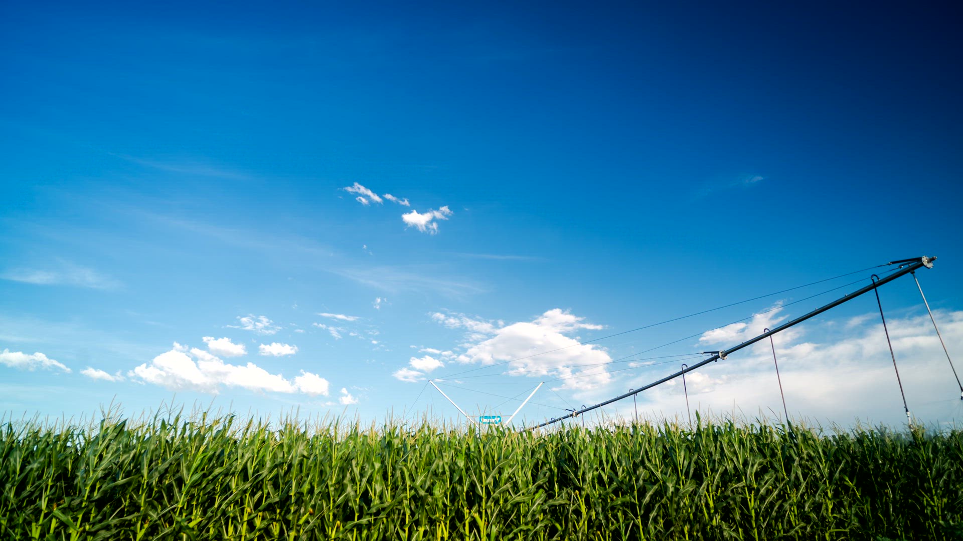 A static daytime timelapse of green corn fields (maize) while centre pivot irrigation system waters the field with cumulous clouds against blue sky.