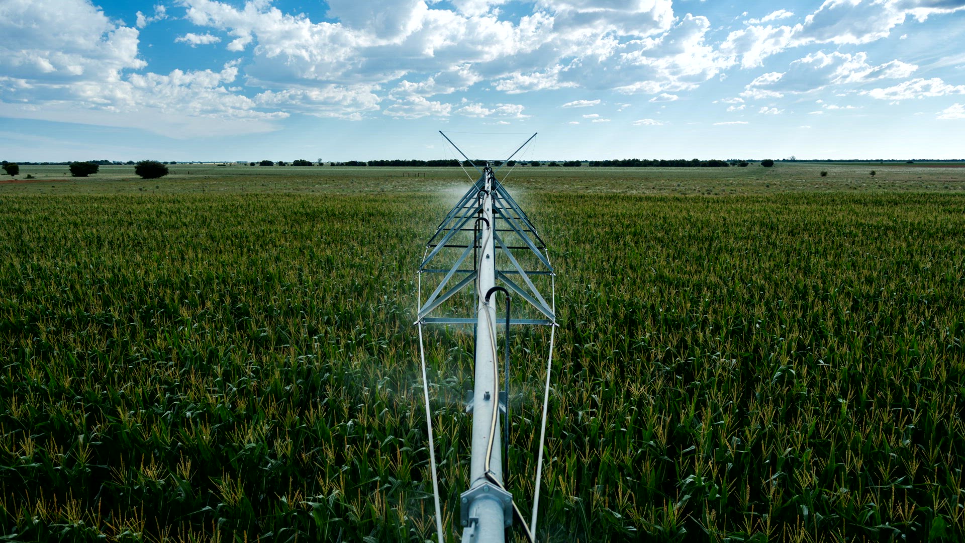 > Creative point of view timelapse on top of centre pivot irrigation system, late afternoon, sun set, with cumulous clouds while sprinklers are on to water corn, South Africa.