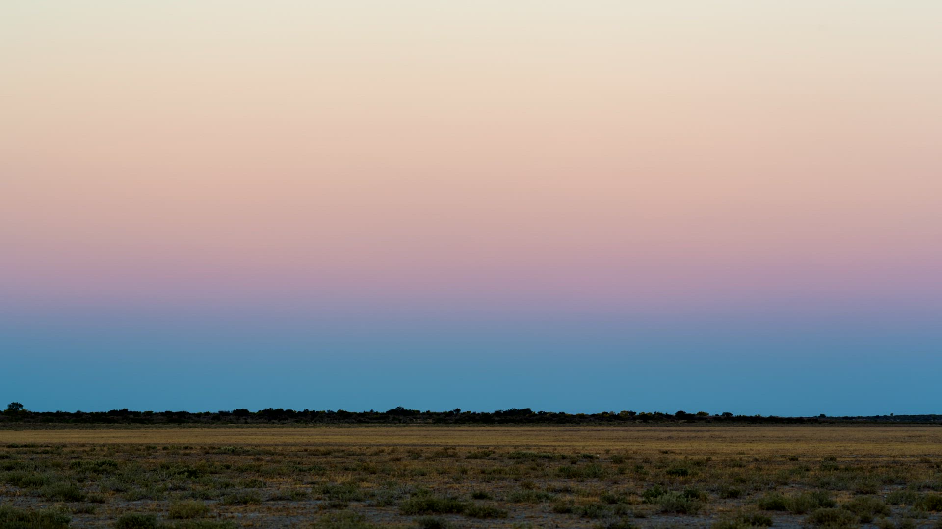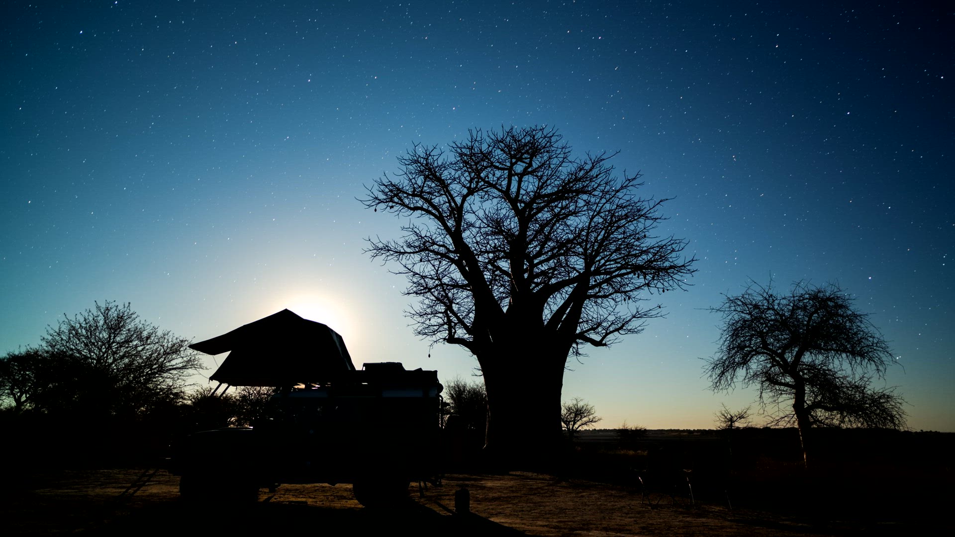> Static timelapse of the Full moon rising over a dry desolate landscape in Africa as night falls over the barren landscape, with hot and cold air distorting the atmosphere, Botswana, Central Kalahari.