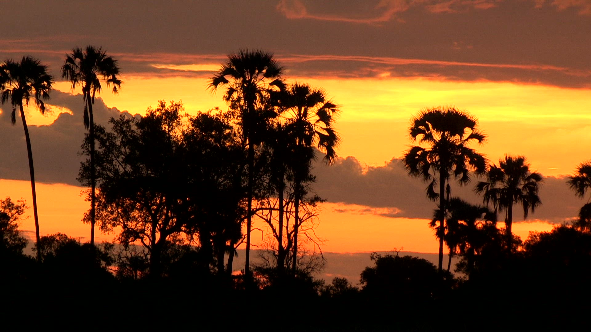 > Silhouette of palm trees in the Okavango Delta