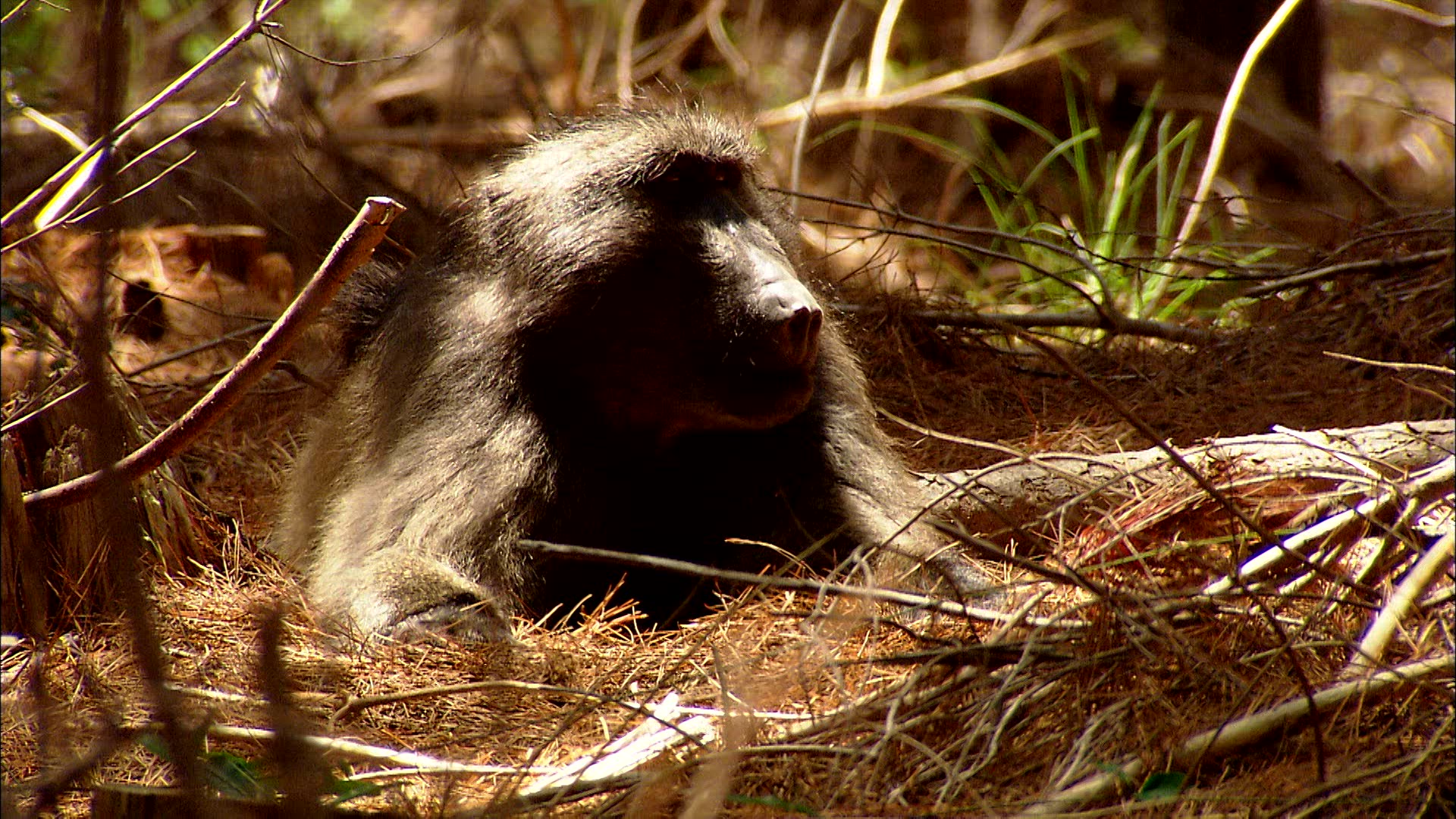 > Baboon lying in pine needles