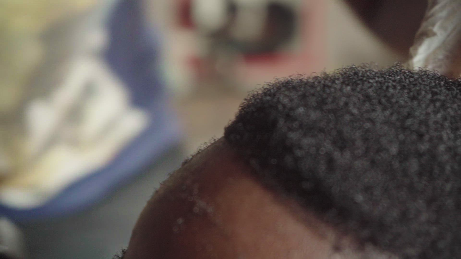 An extreme close up of a barber styling a boy's hair