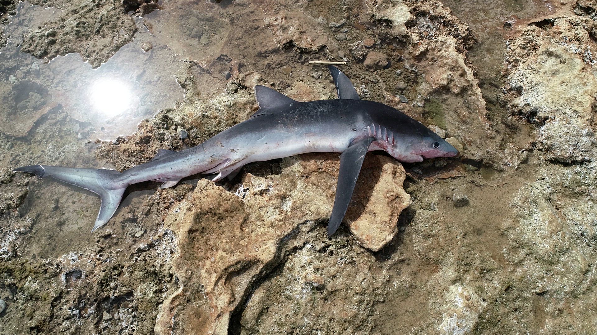 A critically endangered blue shark washed up on a beach in Mallorca in the Mediterranean. Unknown cause of death.