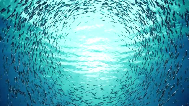 Large school of barracuda inside a marine reserve in the Mediterranean.