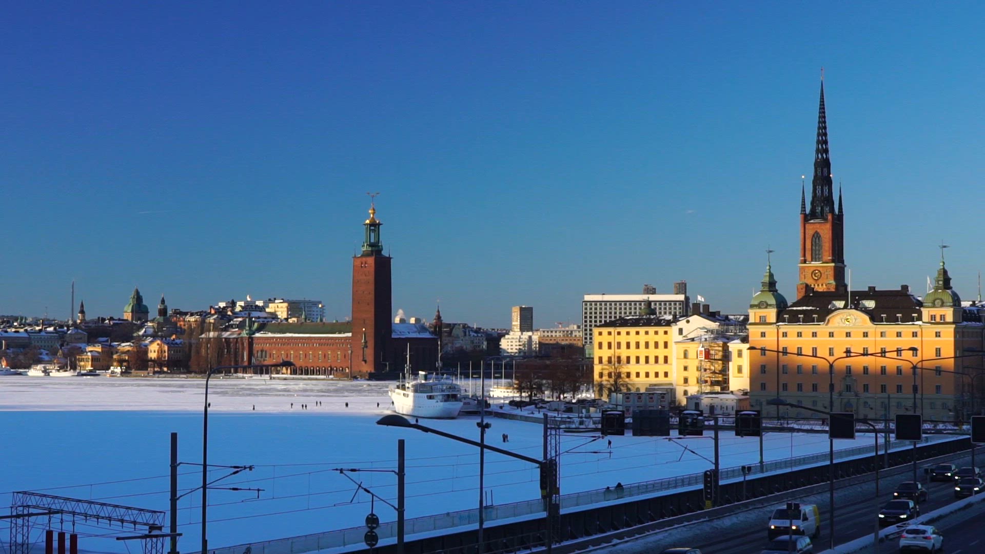 > view over riddarholmen and central stockholm - ice on riddarfjärden - wintertime