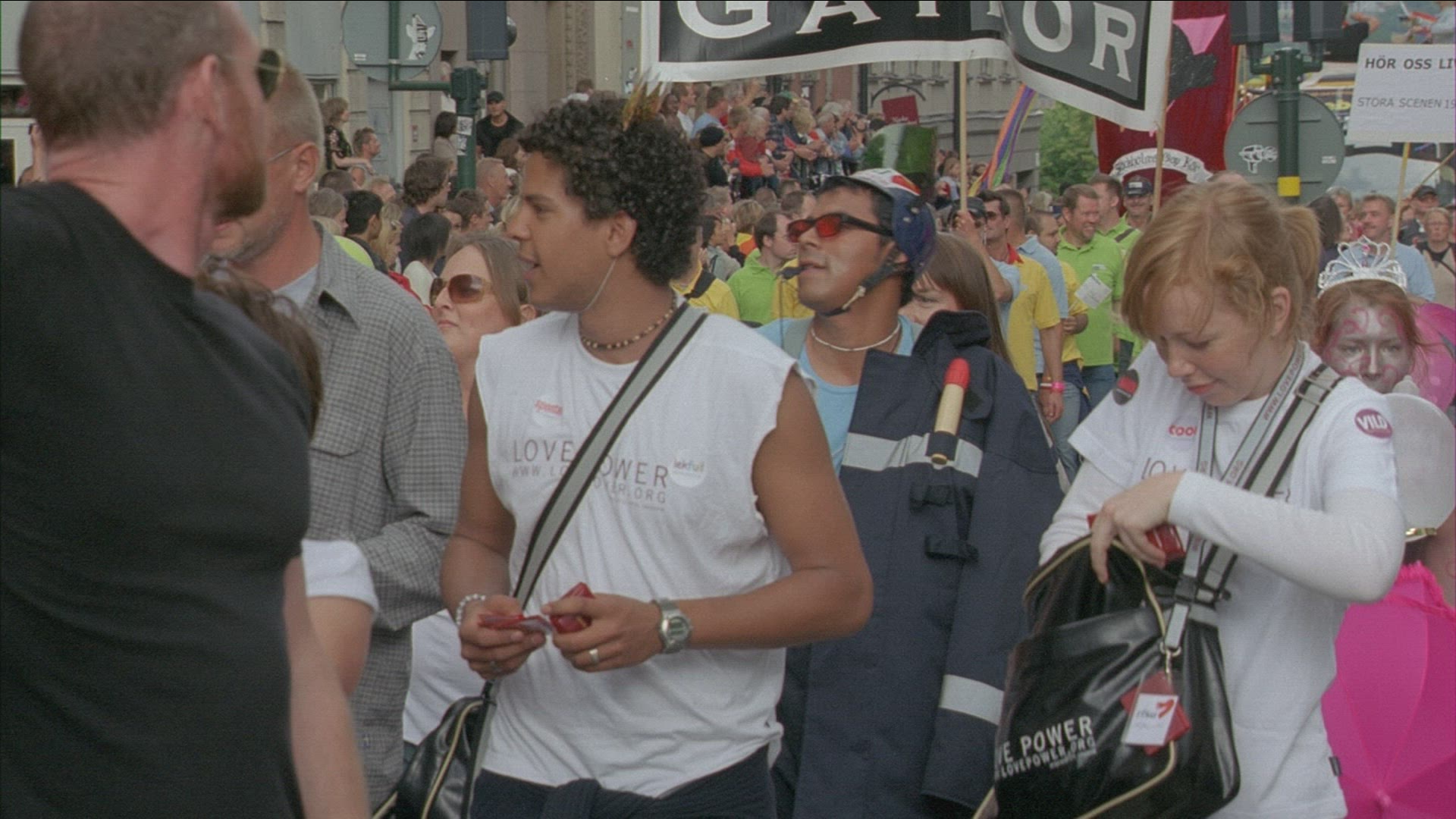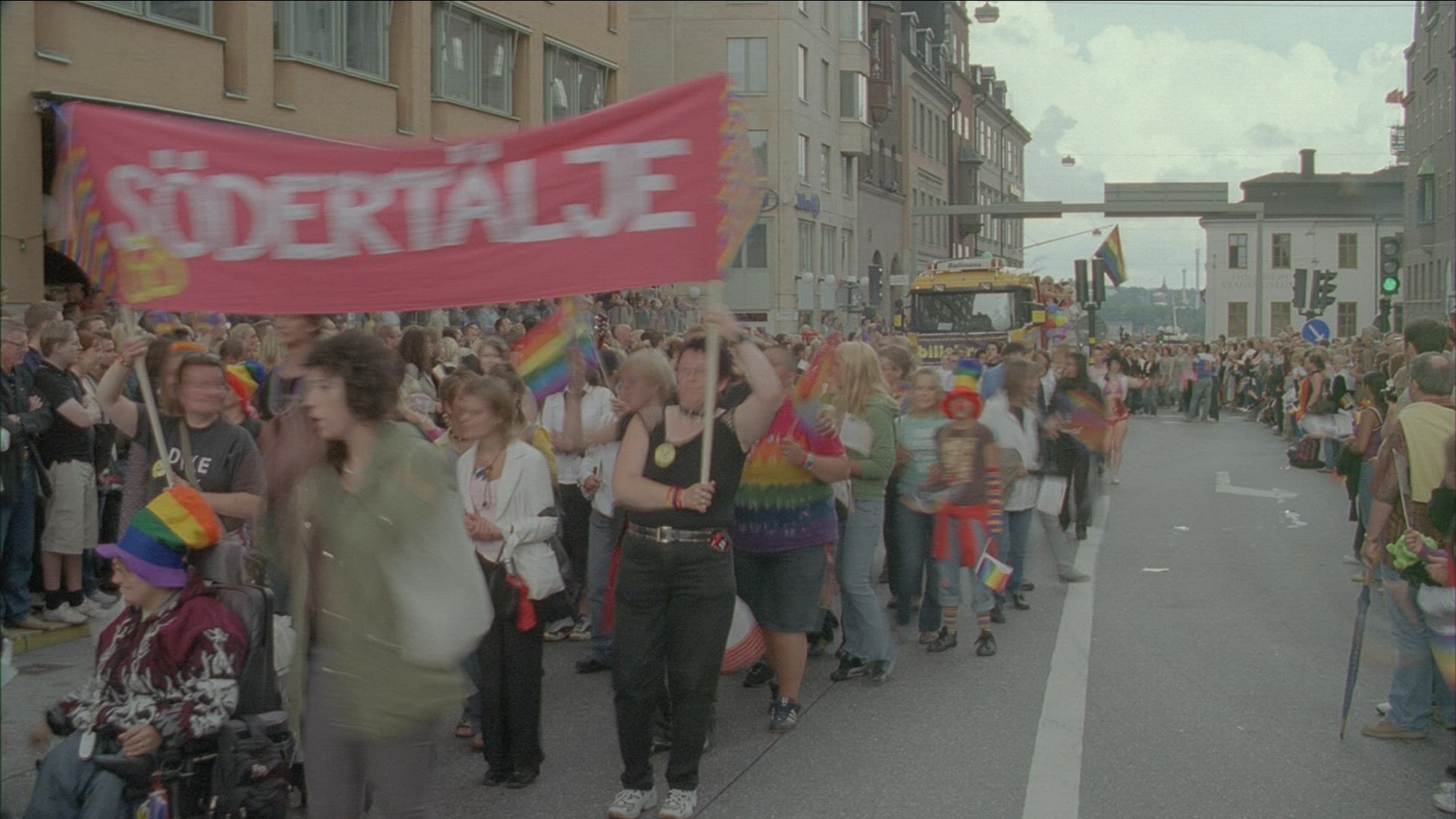 demonstration on first of may in streets of Stockholm - syndicalists SAC walking with banners
