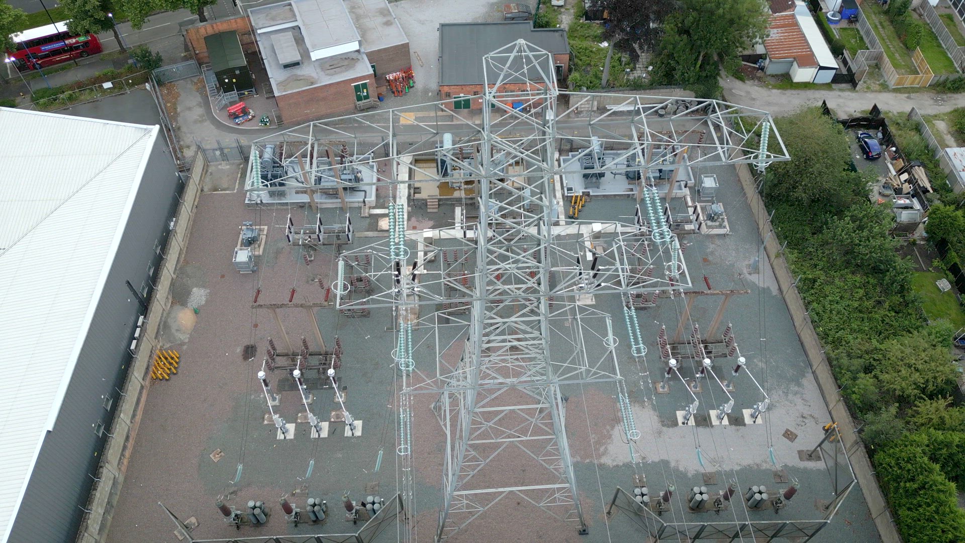 Aerial view of a high voltage electrical substation supplying electricity to an urban area. The substation takes extremely high voltage electricity and steps down for distribution to houses and businesses.