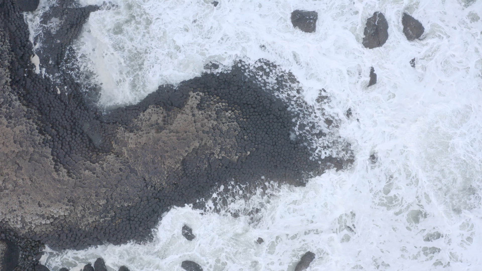 > Ocean Waves Crashing Against Hexagonal Basalt Rock Formation at Giant's Causeway
